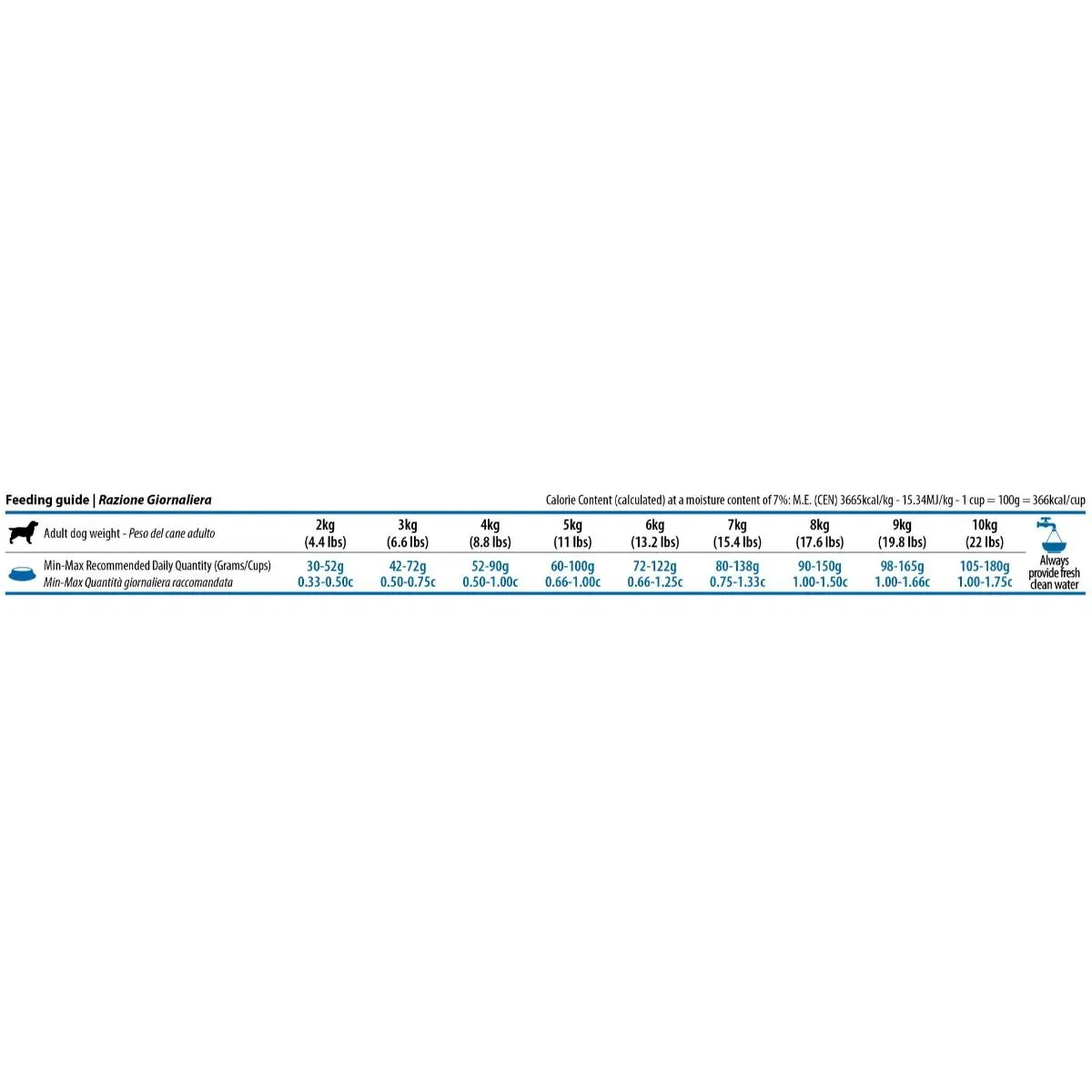 Vedere tabella. Inizialmente si consiglia di miscelare N&D con la dieta precedentemente usata. Conservare in luogo fresco e asciutto e in confezione chiusa. Prodotto 18 mesi prima della data di conservazione minima stampata sul sacco. Prodotto con ingredienti prevalentemente provenienti da Italia, Danimarca e Francia.