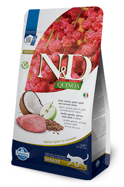 SENIOR • AGNELLO, QUINOA, MELA VERDE E COCCO Alimento completo per gatti anziani.