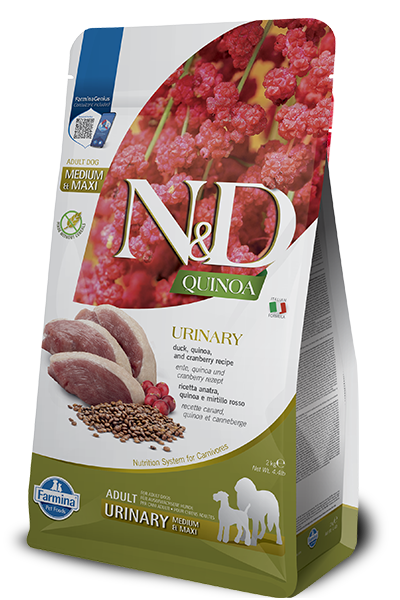 Alimento funzionale completo per cani adulti. N&D Quinoa Urinary è un alimento completo dedicato ai cani adulti per ridurre le recidive da calcoli di struvite.