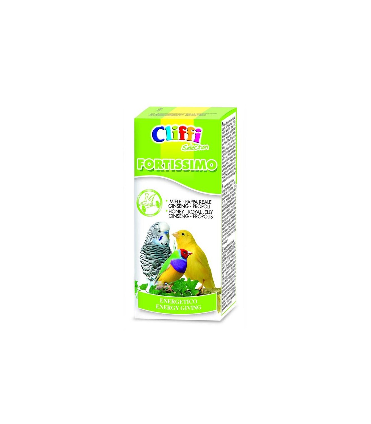 CARATTERISTICHE: Contenente sostanze naturali come il Miele, la Pappa reale, il Ginseng e il Propoli, FORTISSIMOè un forte energetico, particolarmente utile nei cambi di ambiente, per stimolare il canto, nei casi di debilitazione organica durante l'allevamento, per i soggetti anziani o stressati