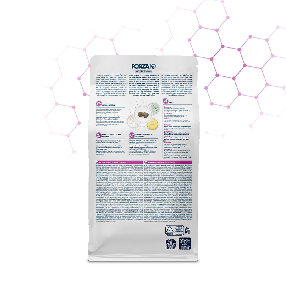 Periodo d’impiego raccomandato: a) supporto della funzione dermica: fino a 2 mesi; b) riduzione di intolleranze a ingredienti e sostanze nutritive: da 3 a 8 settimane. Se i sintomi di intolleranza scompaiono, il mangime può essere impiegato inizialmente fino a un anno. Livello elevato di AL (acido linoleico) e somma di EPA+DHA. Si raccomanda di chiedere il parere di un medico veterinario prima dell’uso; b) e prima di estendere il periodo di impiego.
