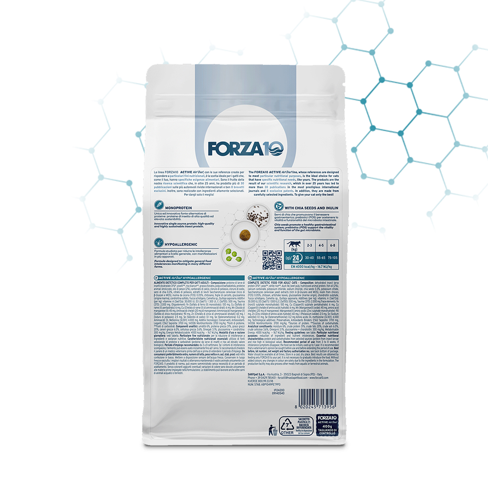 Proteine di larve di insetti disidratate 31%*, piselli**, riso bianco**, grasso d’anatra, polpa di barbabietola, proteine animali idrolizzate, olio di pesce (2%), carbonato di calcio, cloruro di potassio, cloruro di sodio, semi di chia 0.3%, citrato di potassio, estratti di lieviti Saccharomyces cerevisiae (ricco di ß-Glucani e MOS), inulina da cicoria (FOS) 0.05%, chitosano, foglie di carciofo, glucosamina (origine marina), condroitina solfato, Yucca schidigera, Camellia sp., Quillaja saponaria. Additivi (per kg): vitamine: A (3a672a): 30.000 UI, D3 (3a671): 1 300 UI, E (3a700): 500 mg, Taurina (370): 2.000 mg. Oligoelementi: Fe (Solfato di ferro (II) monoidrato): 100 mg, Cu (Solfato di rame (II) pentaidrato): 6 mg, Cu (Chelato di rame (II) di amminoacidi idrati): 6 mg, Mn (Ossido di manganese (II): 45 mg, Aminoacidi chelati (20 mg di manganese): Amminoacidi manganese (II) (Solfato di zinco monoidrato): 90 mg, Zn (Chelato di zinco di amminoacidi idratati): 60 mg, I (Ioduro di potassio): 2.5 mg, Se (Selenito di sodio): 0.1 mg, Se (Selenometionina): 0.2 mg. Aminoacidi: DL Metionina (3c301): 4.000 mg. Additivi tecnologici: Conservanti, Antiossidanti. Leganti: E562 Sepiolite: 3700 mg, 1m558i Montmorillonite: 3700 mg/kg. *Fonti di proteine. **Fonti di carboidrati.
