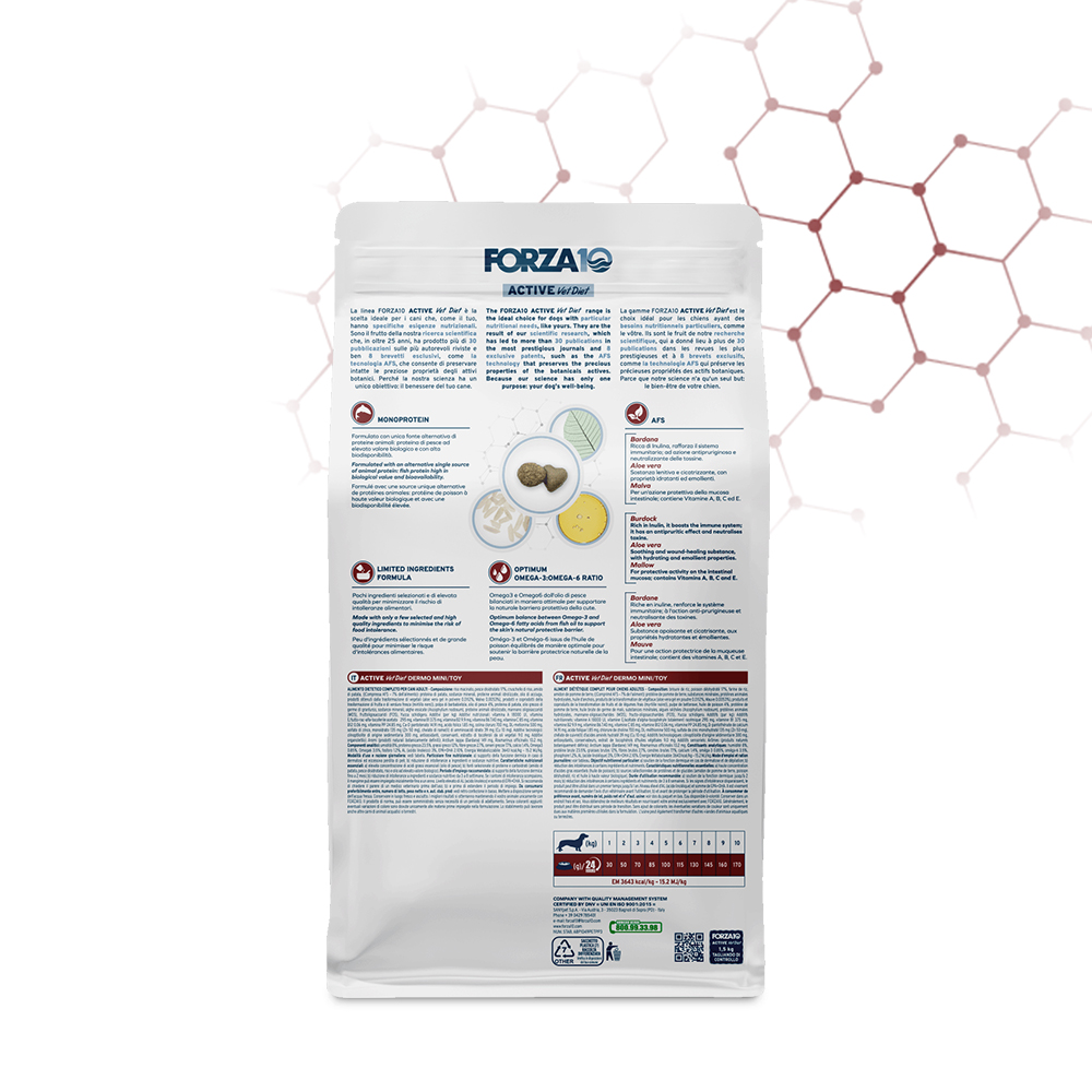 Riso macinato, pesce disidratato 17%, cruschello di riso, amido di patata, (Compressa AFS – 7% dell’alimento): proteina di patata, sostanze minerali, proteine animali idrolizzate, olio di acciuga, prodotti ottenuti dalla trasformazione di vegetali (aloe vera gel in polvere 0.0112%, Malva 0.0053%), prodotti e coprodotti della trasformazione di frutta e di verdura fresca (mirtillo nero)), polpa di barbabietola, olio di pesce 4%, proteina di patata, olio grezzo di germe di granturco, sostanze minerali, alghe essicate (Ascophyllum nodosum), proteine animali idrolizzate, mannano oligosaccaridi (MOS), fruttoligosaccaridi (FOS), Yucca schidigera. Additivi (per kg): Additivi nutrizionali: vitamina A 18000 UI, vitamina E/tutto-rac-alfa-tocoferile acetato 295 mg, vitamina B1 3.75 mg, vitamina B2 9.9 mg, vitamina B6 7.40 mg, vitamina C 85 mg, vitamina B12 0.06 mg, vitamina PP 24.85 mg, Ca-D pantotenato 14.91 mg, acido folico 1.85 mg, colina cloruro 700 mg, DL-metionina 500 mg, solfato di zinco monoidrato 135 mg (Zn 50 mg), chelato di rame(II) di amminoacidi idrato 39 mg (Cu 10 mg). Additivi tecnologici: clinoptilolite di origine sedimentaria 300 mg, antiossidanti, conservanti, estratto di tocoferoli da oli vegetali 9.0 mg. Additivi organolettici: Aromi (prodotti naturali botanicamente definiti): Arctium lappa (Bardana) 149 mg, Rosmarinus officinalis 10.2 mg.