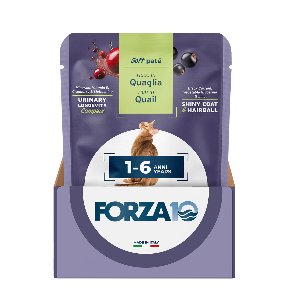 Carni e derivati (quaglia 14%), lieviti, oli e grassi (olio di salmone 0.1%), frutta (mirtillo rosso 0.01%, ribes nero 0.01%), sottoprodotti di origine vegetale (glicerolo vegetale 0.01%), sostanze minerali. Additivi (per kg): Additivi nutrizionali: vitamina E 20 mg, vitamina B1 1.5 mg, vitamina B6 0.5 mg, vitamina H (Biotina) 0.07 mcg, acido folico 3.9 mcg, taurina 400 mg, solfato di zinco monoidrato 11.3 mg (Zn 4.1 mg), solfato manganoso monoidrato 5.2 mg (Mn 1.7 mg), DL-Metionina 1500 mg.