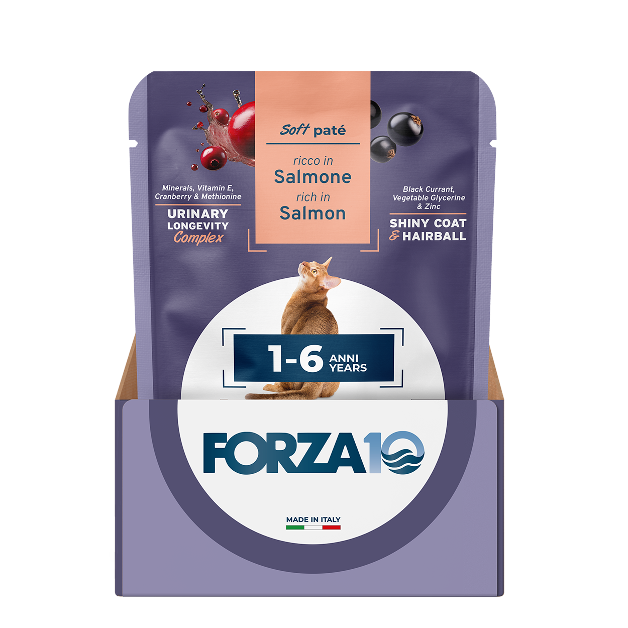 Carni e derivati, pesci e sottoprodotti dei pesci (salmone 14%), lieviti, oli e grassi (olio di salmone 0.1%), sottoprodotti di origine vegetale (glicerolo vegetale 0.01%), frutta (mirtillo rosso 0.01%, ribes nero 0.01%), sostanze minerali. Additivi (per kg): Additivi nutrizionali: vitamina E 20 mg, vitamina B1 1.5 mg, vitamina B6 0.5 mg, vitamina H (Biotina) 0.07 mcg, acido folico 3.9 mcg, taurina 400 mg, solfato di zinco monoidrato 11.3 mg (Zn 4.1 mg), solfato manganoso monoidrato 5.2 mg (Mn 1.7 mg), DL-Metionina 1500 mg.