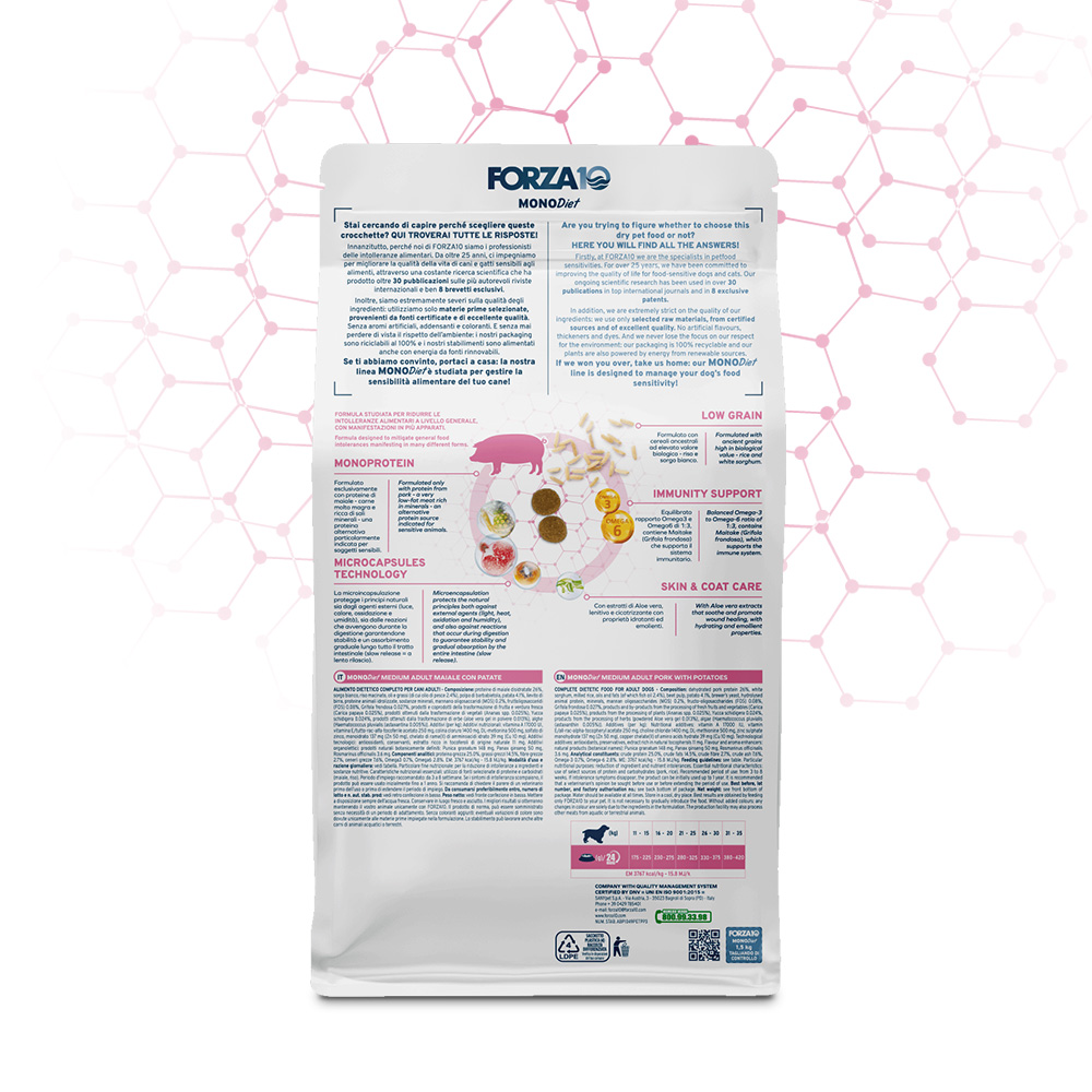 Forza 10 Diet Medium Maiale e Patate kg.12 è la referenza della Linea Dietetica studiata da SANYpet per soddisfare tutti i cani di media taglia affetti da ipersensibilità alla carne, specie se derivante da allevamento intensivo.