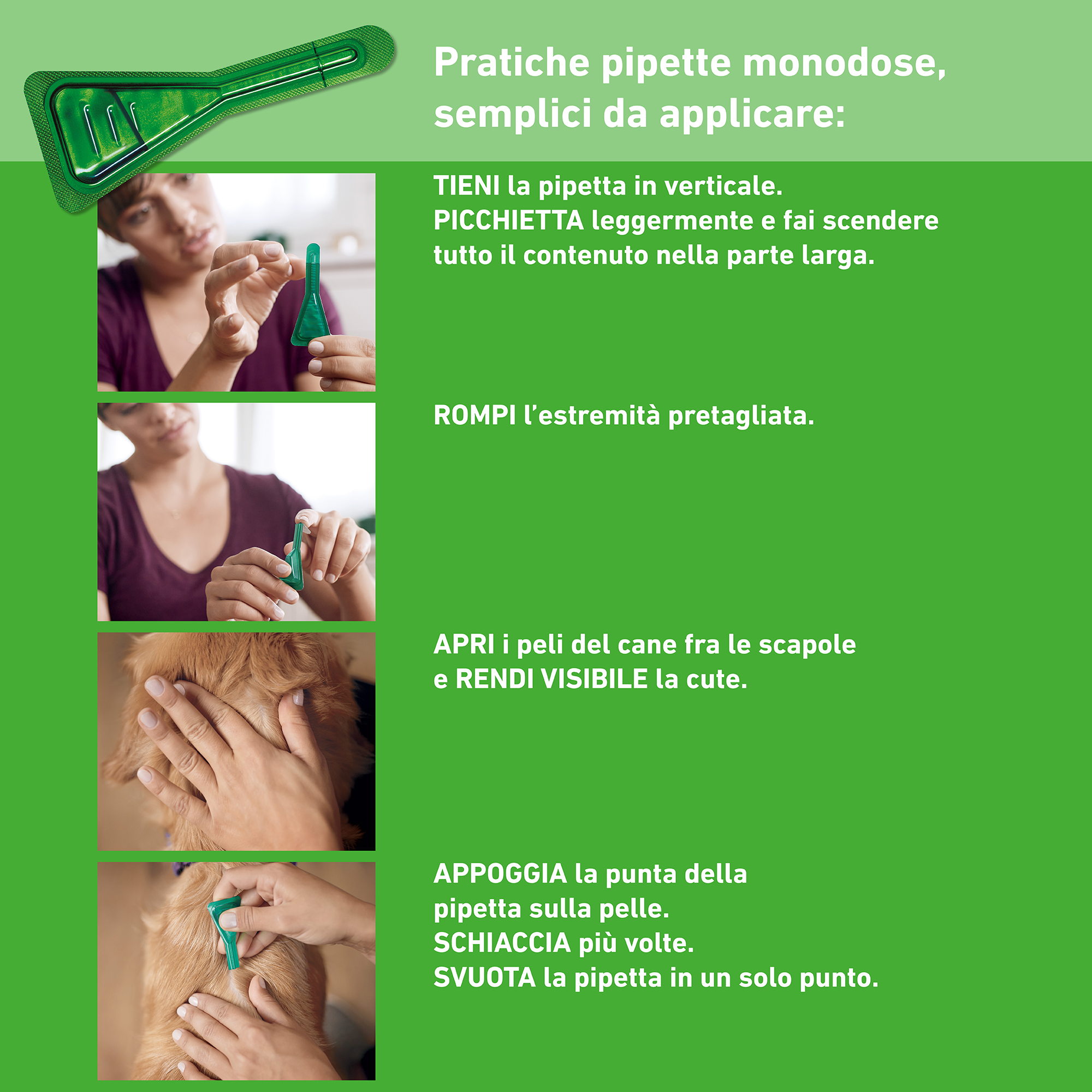 protegge il cane contro le pulci per 2 mesi e contro le zecche per 1 mese. Si sconsigliano immersioni in acqua o bagni nei 2 gg successivi l' applicazione.