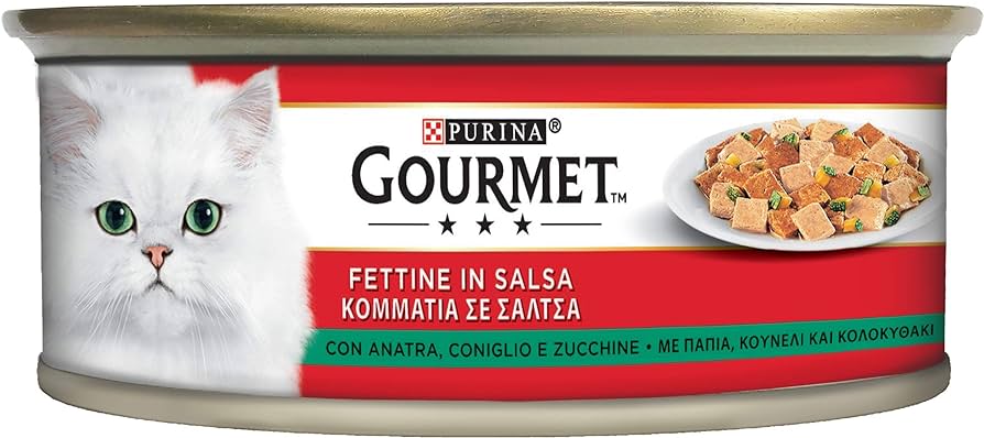 Gourmet Fettine Anatra Coniglio Zucchine 195 gr Per Gatticonfezione da 12 pz. € 1.05 cad. prezzo unitario