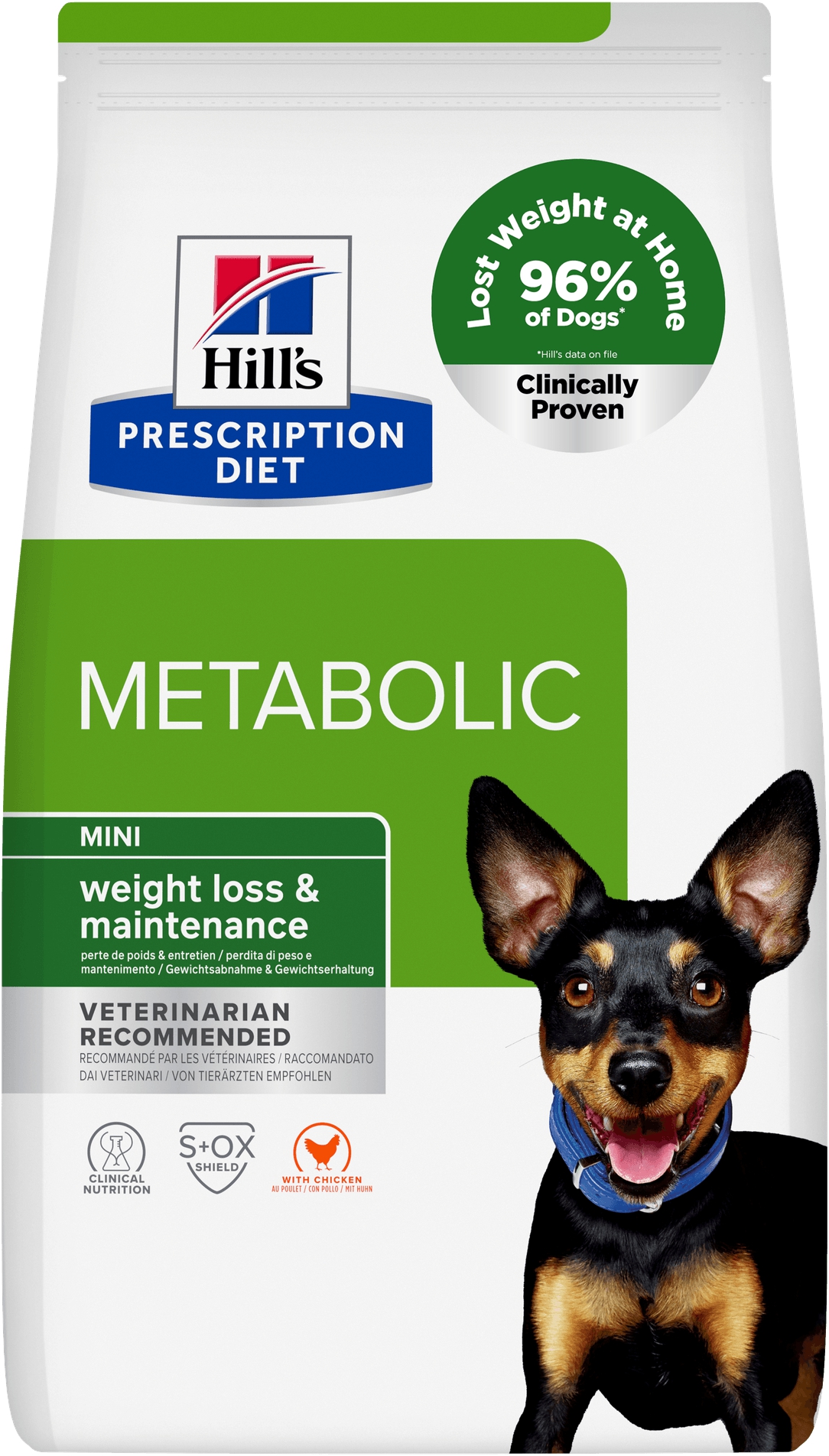 L'alimento secco Hill's Prescription Diet Metabolic Mini è stato concepito secondo le più recenti scoperte scientifiche e offre un supporto nutrizionale per i cani in sovrappeso che devono seguire un regime alimentare dietetico. Può contribuire a una diminuzione del peso efficace e a lungo termine, nonché a mantenere il peso ideale.