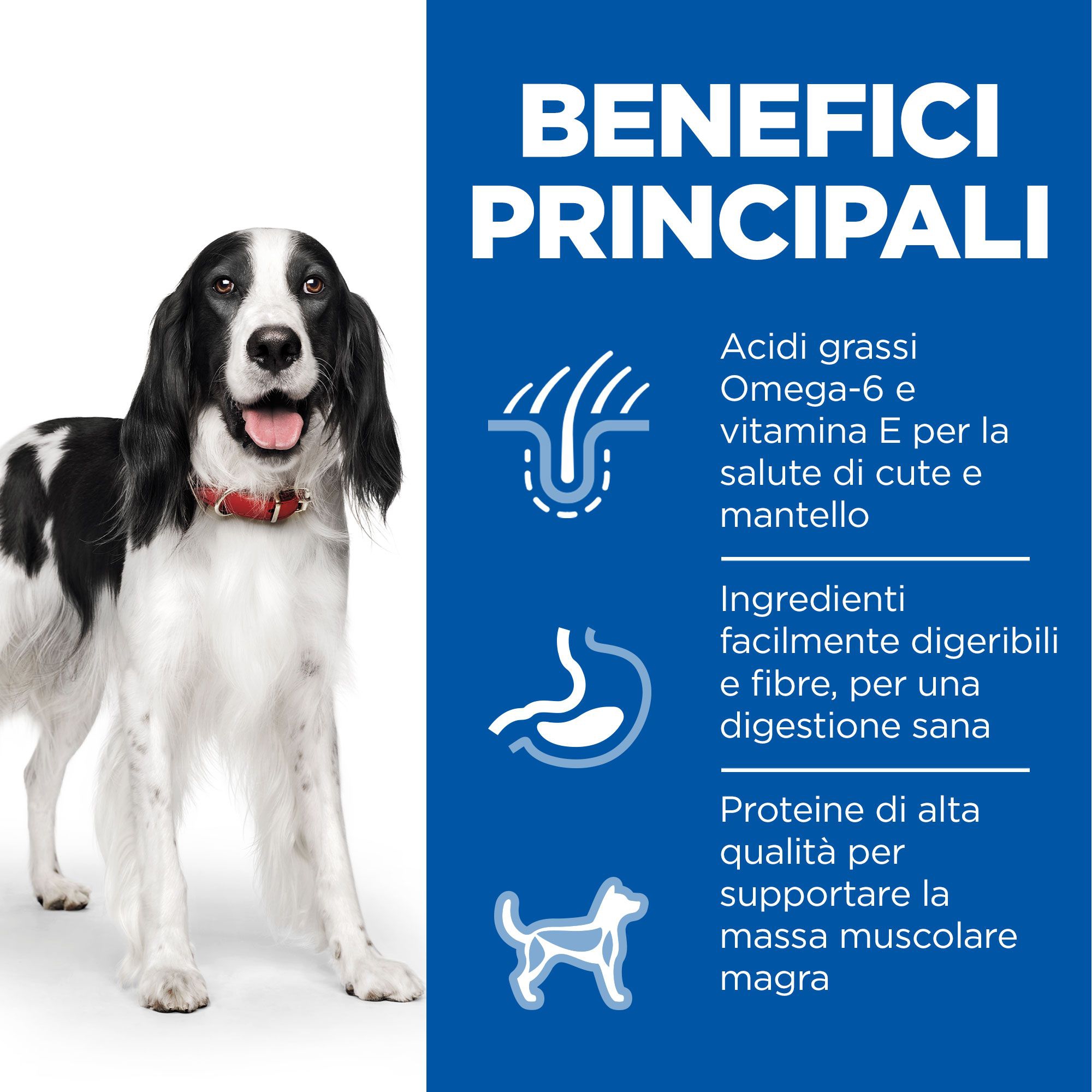 Informazioni aggiuntiveOttima e gustosa nutrizione per una vita lunga e felice. Nessuno può salutarti come il tuo cane, con una coda che scodinzola e ti lecca la faccia. Ogni momento che trascorrete insieme è speciale, per questo ci impegniamo a darti di più. Con ingredienti di alta qualità e i corretti nutrienti, Hill's Science Plan è correttamente preparato per offrire al tuo cane la nutrizione di cui ha bisogno per una vita lunga, felice e in salute.