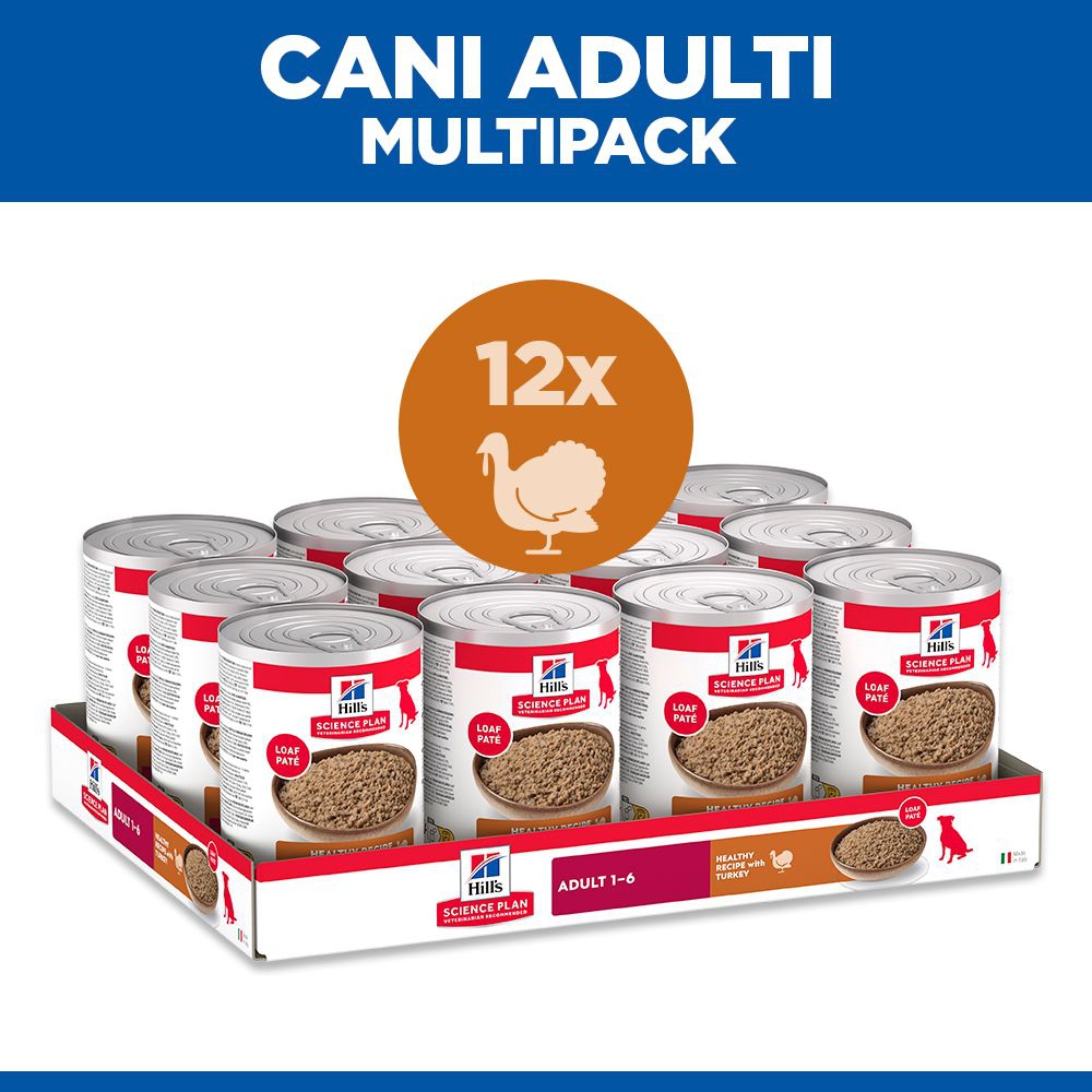 Ogni cane merita una vita lunga e felice, piena di code scodinzolanti. I nostri gustosi alimenti aiutano i cani a vivere la loro vita al meglio. Hill's Science Plan Adult alimento umido per cani con tacchino è un alimento completo per cani adulti da 1 a 6 anni. Questo alimento irresistibilmente morbido e saporito offre il perfetto equilibrio tra gusto e nutrizione. Formulato appositamente per fornire la quantità di energia adeguata a favorire il peso forma nei cani adulti. Vantaggi principali: