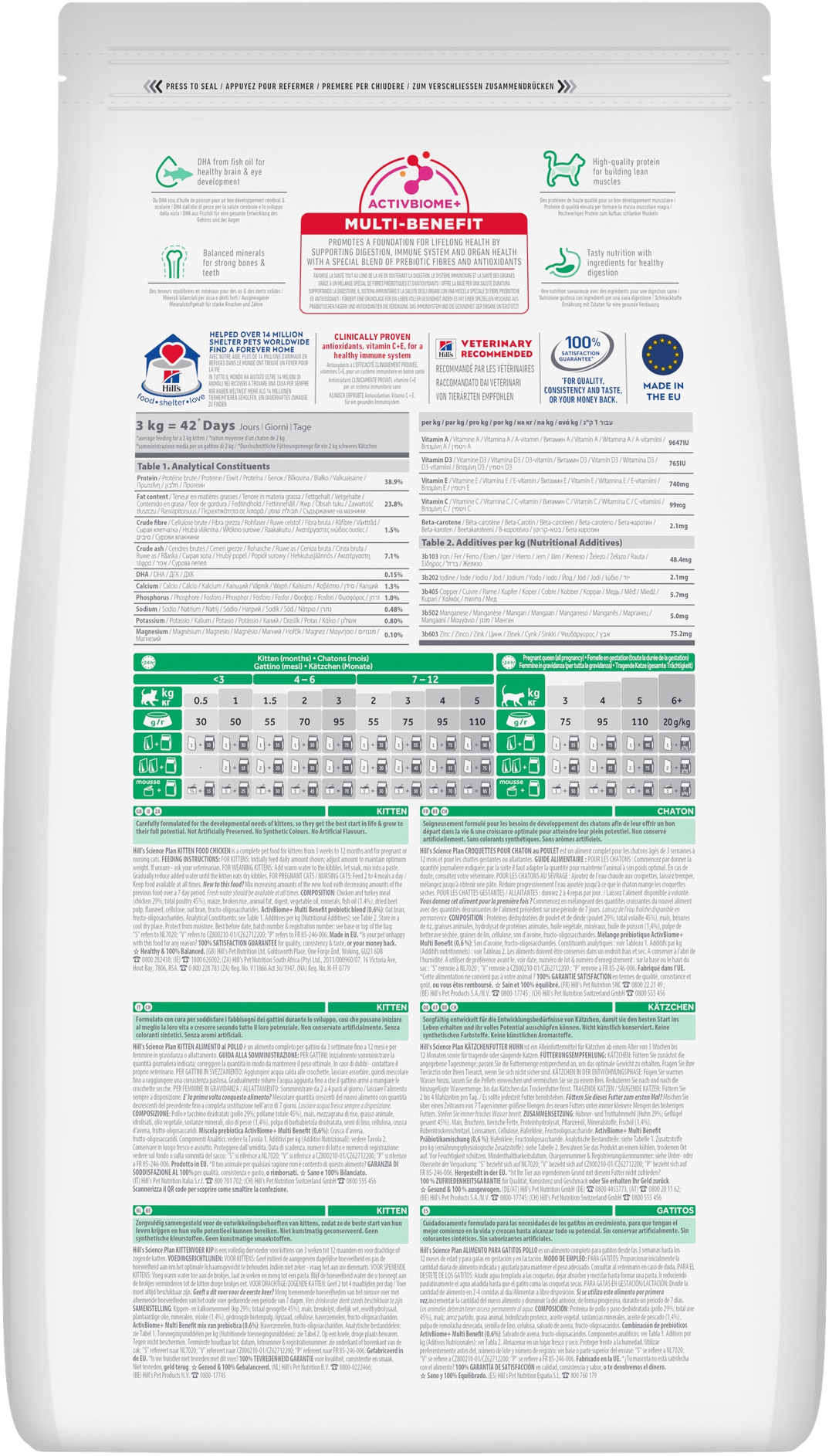 Hill’s Science Plan Kitten alimento secco per gatti con pollo è un alimento sano e bilanciato al 100%. Contiene la tecnologia ActivBiome+ Multi-Benefit, una miscela di fibre prebiotiche e antiossidanti, che favorisce la salute dell’apparato digerente e il benessere generale del tuo gatto nel corso della sua vita. Un’alimentazione basata sulla scienza per favorire una vita lunga e sana. Vantaggi principali: