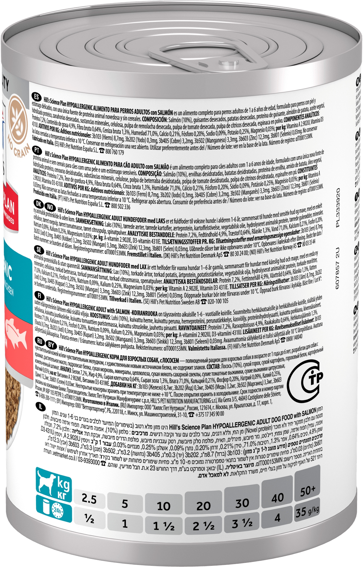 Hill's Science Plan Hypoallergenic Adult Dog Food con Salmone è un alimento completo per cani adulti da 1 a 6 anni. Una ricetta delicata, formulata con fonti proteiche innovative limitate e di alta qualità e senza cereali, questo alimento umido ipoallergenico per cani è studiato appositamente per soddisfare le esigenze dei cani con sensibilità, con una consistenza irresistibile e un gusto appetitoso.
