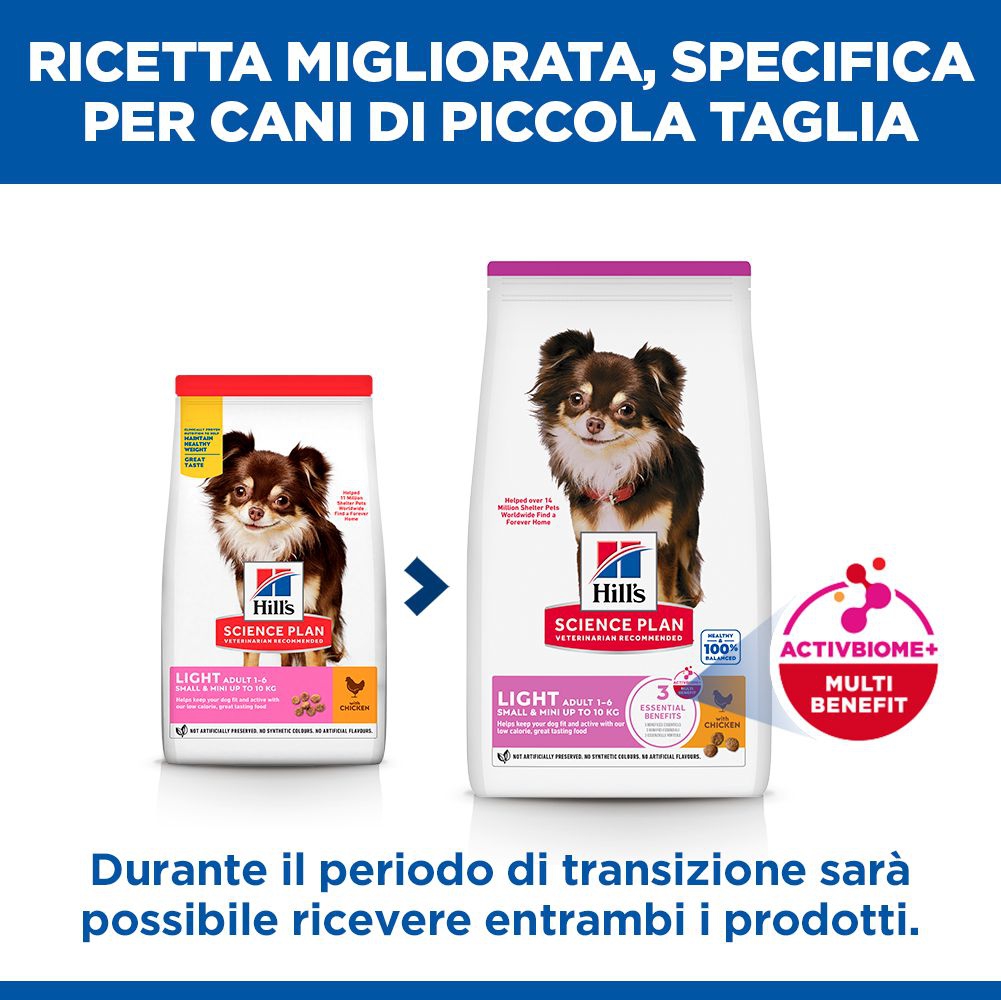 Crocchette Hill' s Science Plan Adult 1-6 Light Small & Mini con Pollo per cani piccoli (max 10 kg), per il controllo del peso, a effetto saziante, con antiossidanti, acidi grassi Omega e vitamina E.