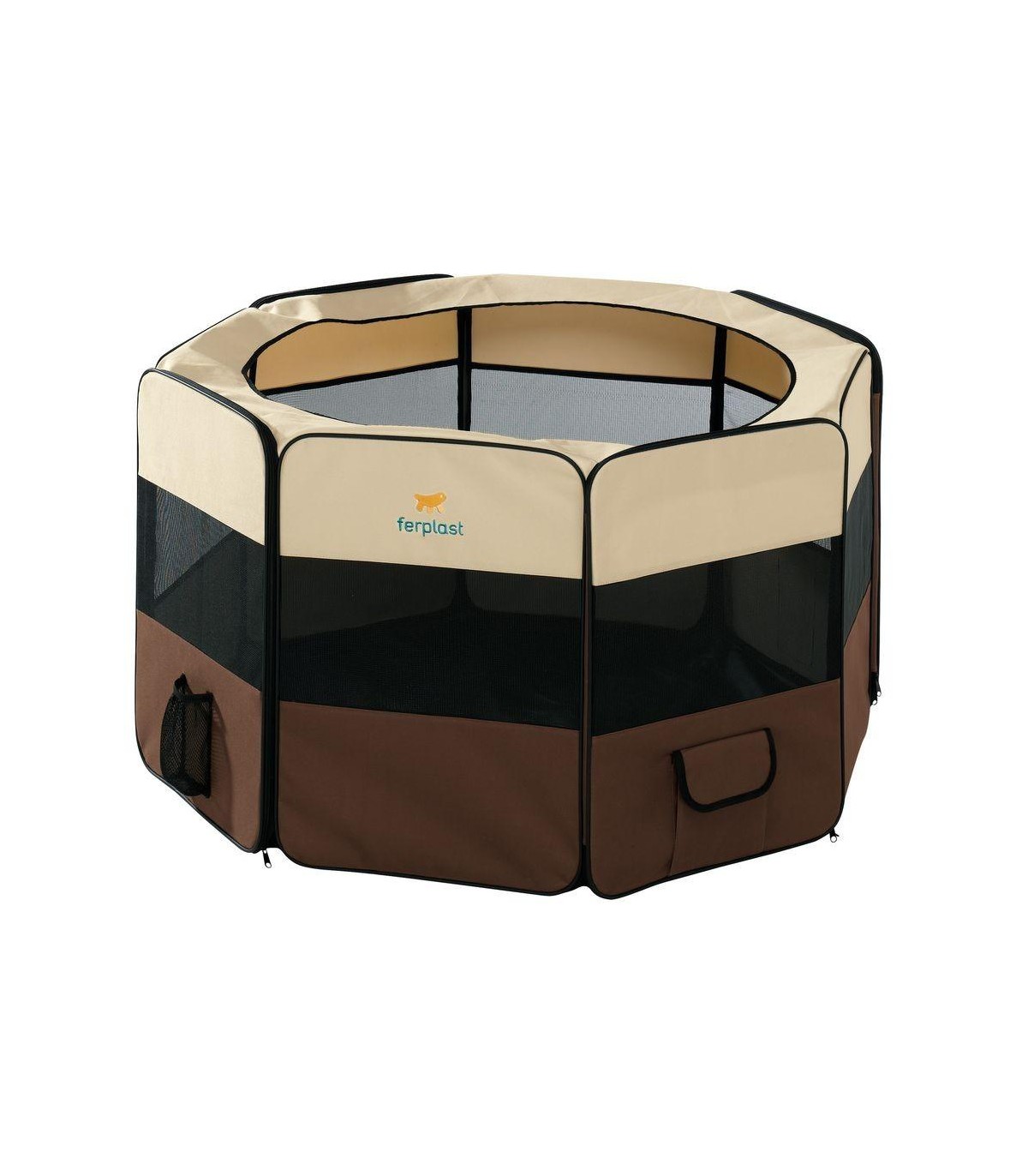 Questo recinto per cuccioli e cani di piccola taglia ha una particolare forma ottagonale con parti in rete per assicurare la visibilità dell'animale all'interno. Dotato di utilissime tasche laterali porta accessori come ad esempio snack per cani da portare con voi in occasione di manifestazioni o esposizioni canine.