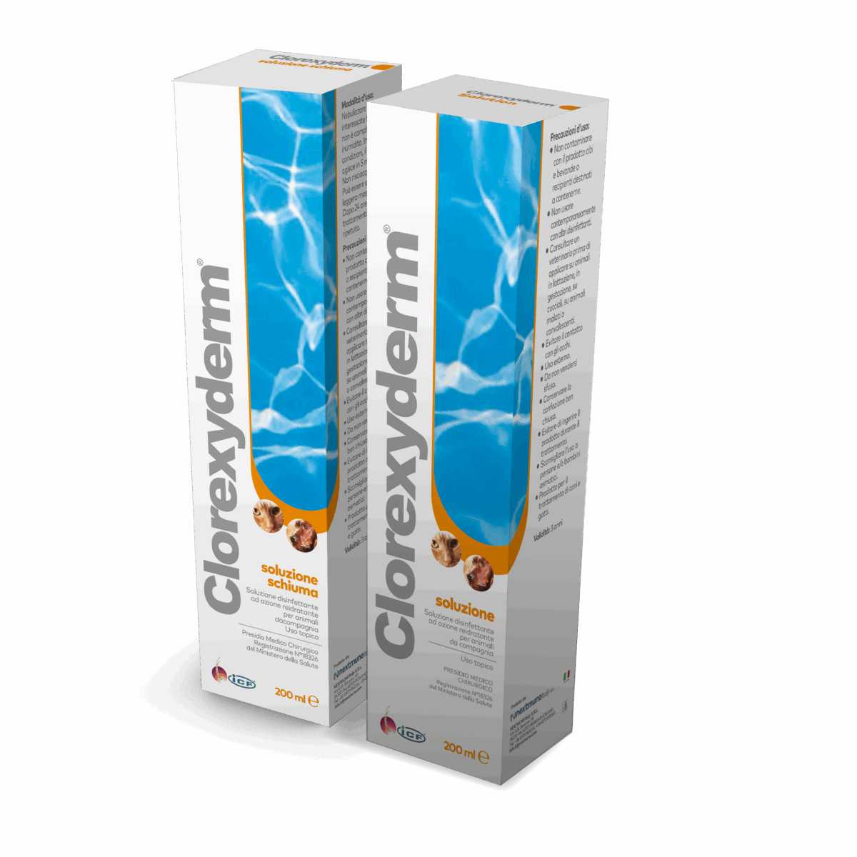 Clorexyderm Soluzione è un disinfettante ad ampio spettro a base di clorexidina, attivo nei confronti dei batteri Gram+ e Gram-. Clorexyderm è inoltre efficace nei confronti di Malassezia Pachidermatys per Uso Topico. Ricco di sostanze idratanti ed emollienti che non richiede risciacquo dopo l’applicazione. Attivo verso microrganismi sensibili alla Clorexydina. La sua formula liquida non oleosa non irrita e permette il trattamento di aree cutanee molto estese da disinfettare. L'azione è molto rapida anche su manti a pelo lungo.