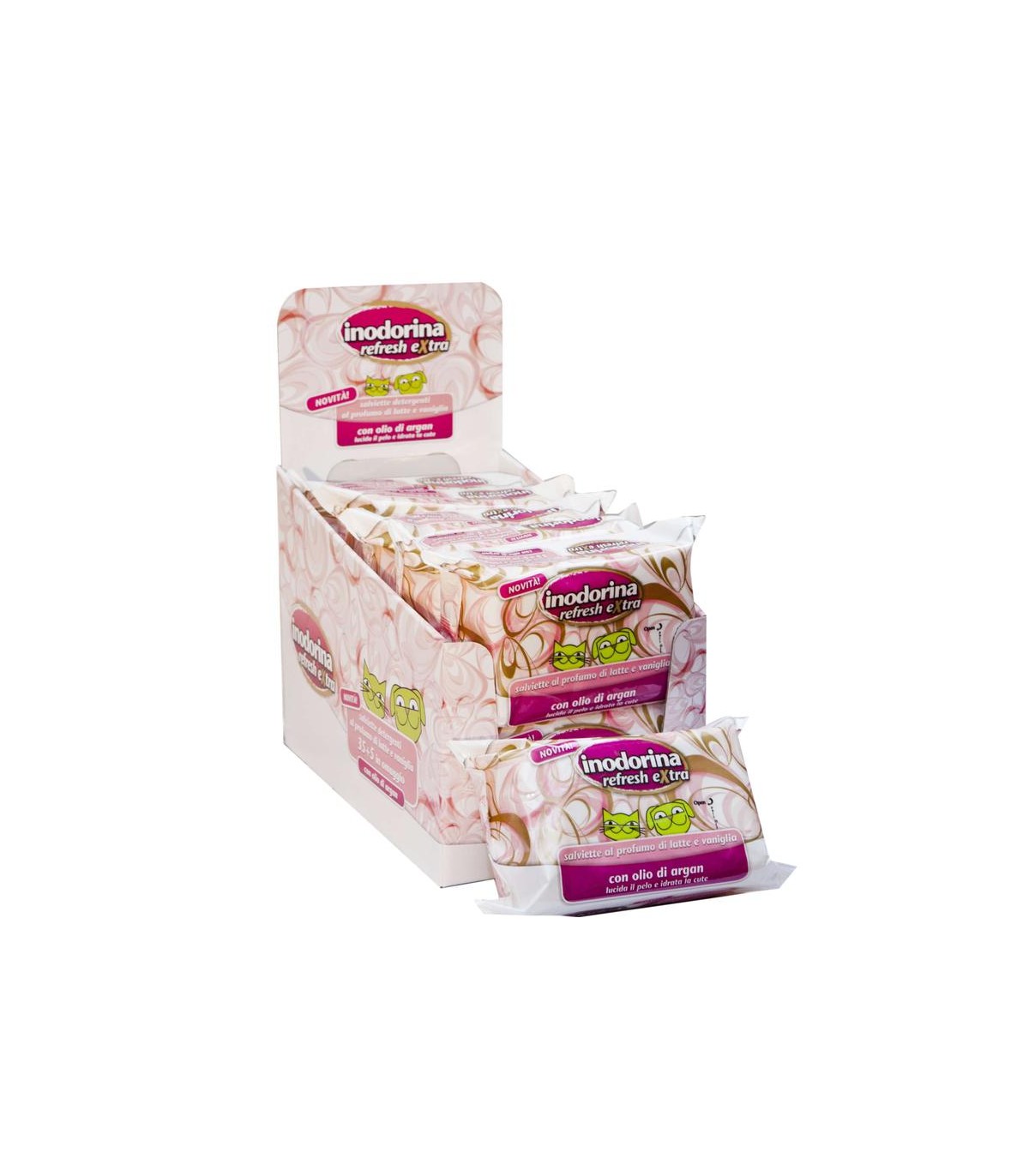 Inodorina refresh extra salviette al latte e vaniglia con olio di argan salviette igienizzanti e profumate in tessuto resistente, umidificate con una formulazione unica a base di olio di argan, ricco di vitamine (A,E,F) e noto per le sue proprietà lenitive, nutrienti ed idratanti.