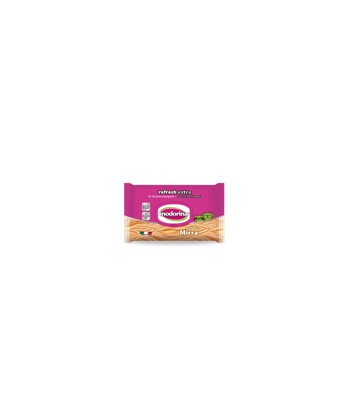 Salviette profumate in tessuto resistente, umidificate con una formulazione unica a base di olio di argan, ricco di vitamine (A,E,F) e noto per le sue proprietà lenitive, nutrienti ed idratanti. Inodorina Refresh eXtra, rispettando il Ph naturale, deodora, e lucida il manto di gatti, cani e cuccioli rilasciando una gradevole profumazione.