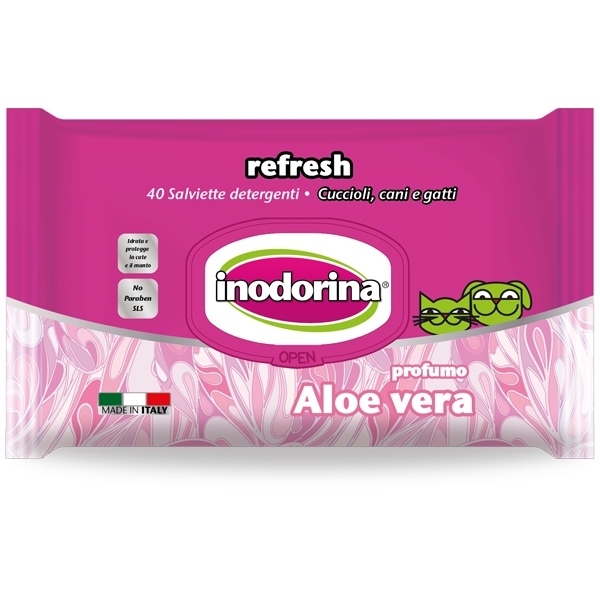 Salviette profumate in tessuto resistente, umidificate con un agente idratante, emolliente e protettivo, che rispettando il pH naturale, deodorano, e lucidano il manto di gatti, cani e cuccioli. Le salviette Inodorina Refresh sono utilissime nei momenti di vita quotidiana con il nostro animale: prima di un viaggio in auto e al termine di una passeggiata o di una gita all’aperto. Inodorina Refresh è particolarmente indicata al momento del rientro in casa nei giorni di pioggia perché neutralizza le molecole di cattivo odore sul manto bagnato, lasciando il pelo deterso e profumato.