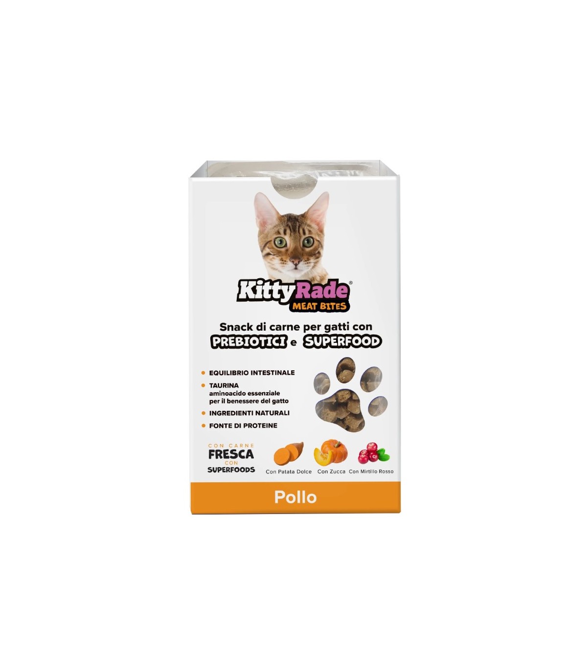 Doggyrade Meat Bites - con Prebiotici e Superfood sono snack di carne semiumidi per gatti. Realizzati con carne fresca e ingredienti naturali al 100%, questi gustosi bocconcini funzionali contengono prebiotici e superfood, tra cui patata dolce, zucca e semi di lino.