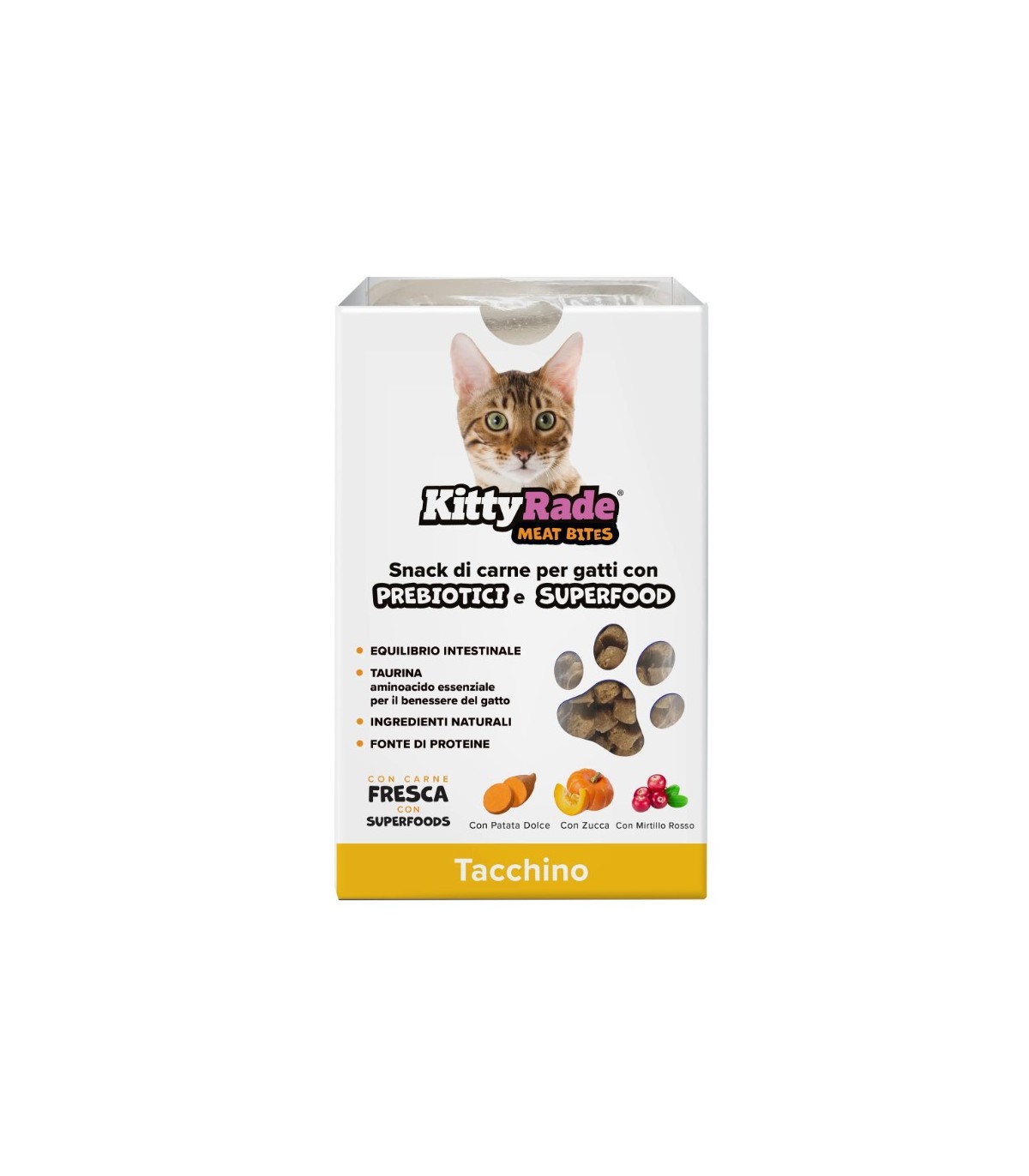 Doggyrade Meat Bites - con Prebiotici e Superfood sono snack di carne semiumidi per gatti. Realizzati con carne fresca e ingredienti naturali al 100%, questi gustosi bocconcini funzionali contengono prebiotici e superfood, tra cui patata dolce, zucca e semi di lino.
