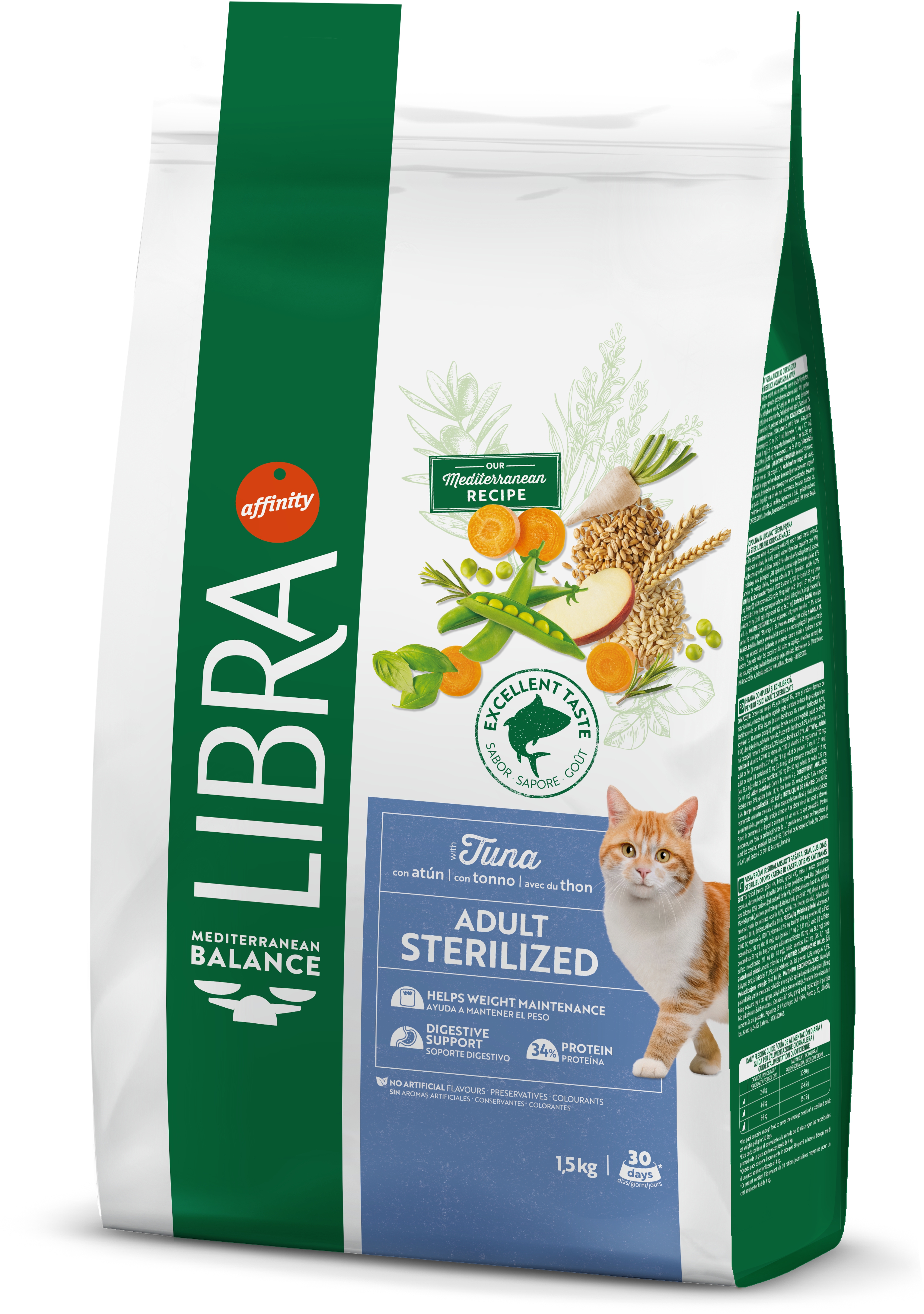 Cibo completo ed equilibrato per gatti adulti sterilizzati. Cereali (4% orzo), sottoprodotti di carne e animali, estratti proteici vegetali, prodotti per i prodotti di pesce e pesce (tonno del 10% disidratato), sottoprodotti di origine vegetale, oli e grassi, verdure, sostanze minerali. Taurine 700 mg, vitamina A 27000 IU, Vitamina D3 1800 Ui, Vitamina D3 1800 Ui, Vitamina E 95 mg, vitamina C, ferro 78 mg, iodio 1,31 mg, rame 8 mg, manganese 36,5 mg, zinco 80 mg, selenio 0,1 mg, Umidità 6%, Proteina 35%, grasso 11,7%, fibra bruta 5%, minerali 7,5%, calcio 1%, fosforo 0,8%, sodio 0,7%, potassio 0,8%, magnesio 0,14%, omega 3 0,22%, omega 6 1,5% , Energia metabolizzabile 3590 kcal / kg ? Nessun aroma artificiale, conservanti o coloranti. ? Controllo del peso ? Denti forti e ossa ? Digestione sana
