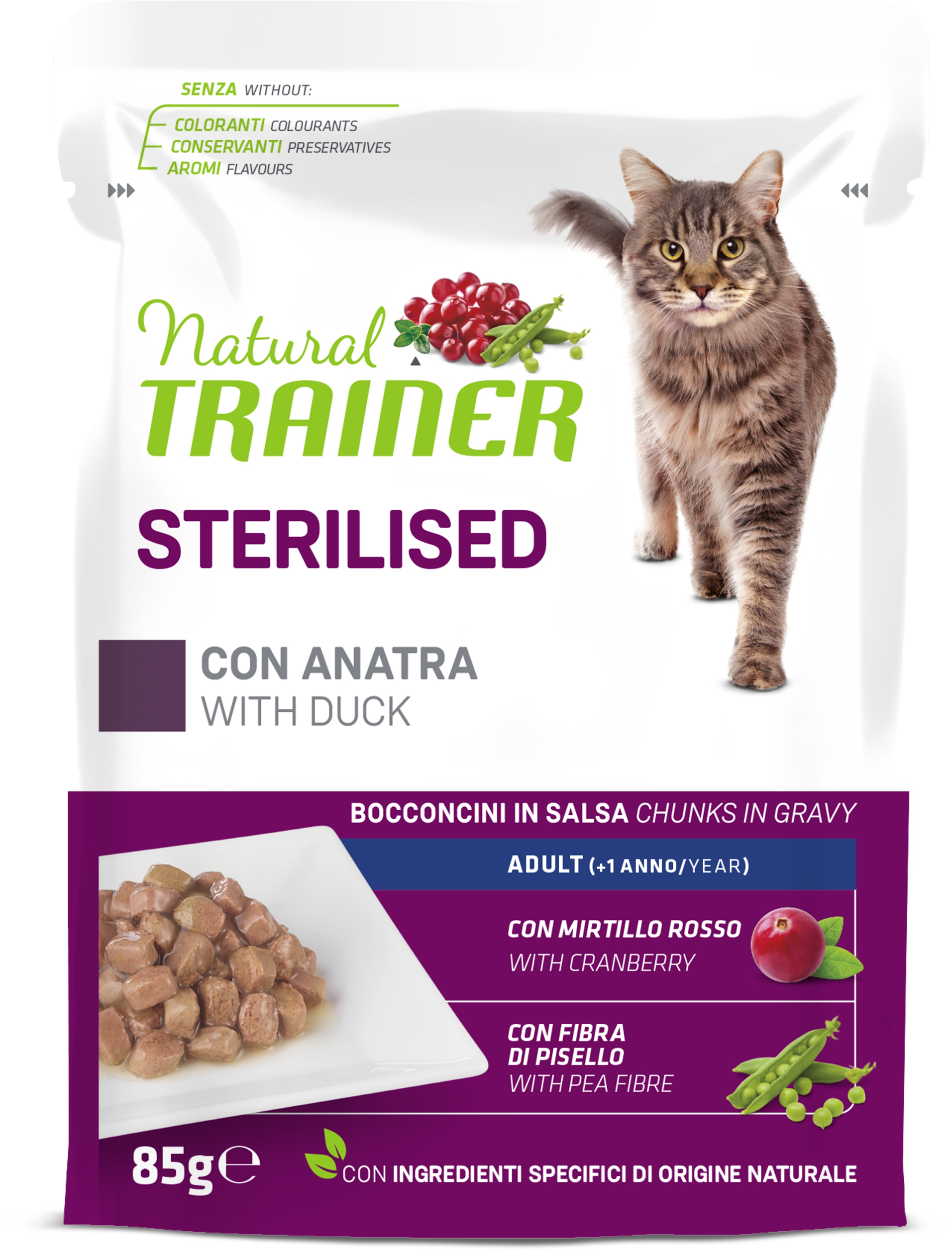 Composizione: pollame (fresco 4%) , maiale (fresco 4%) , anatra 4% , amido di granturco , manzo , fibra di pisello* 1% , sostanze minerali , amido di patata , destrosio , mirtillo rosso disidratato* 0,01%. , *Ingredienti specifici di origine naturale