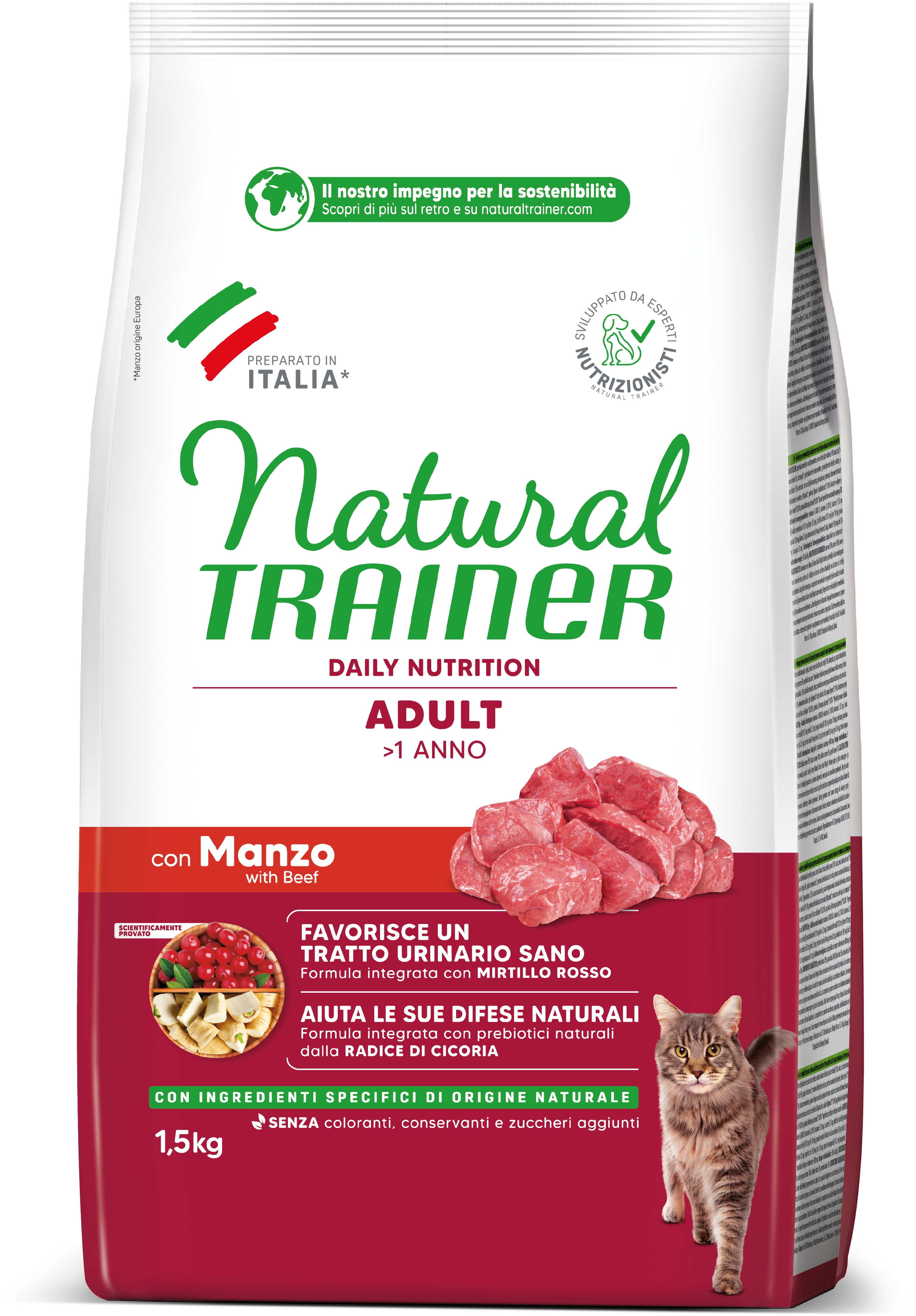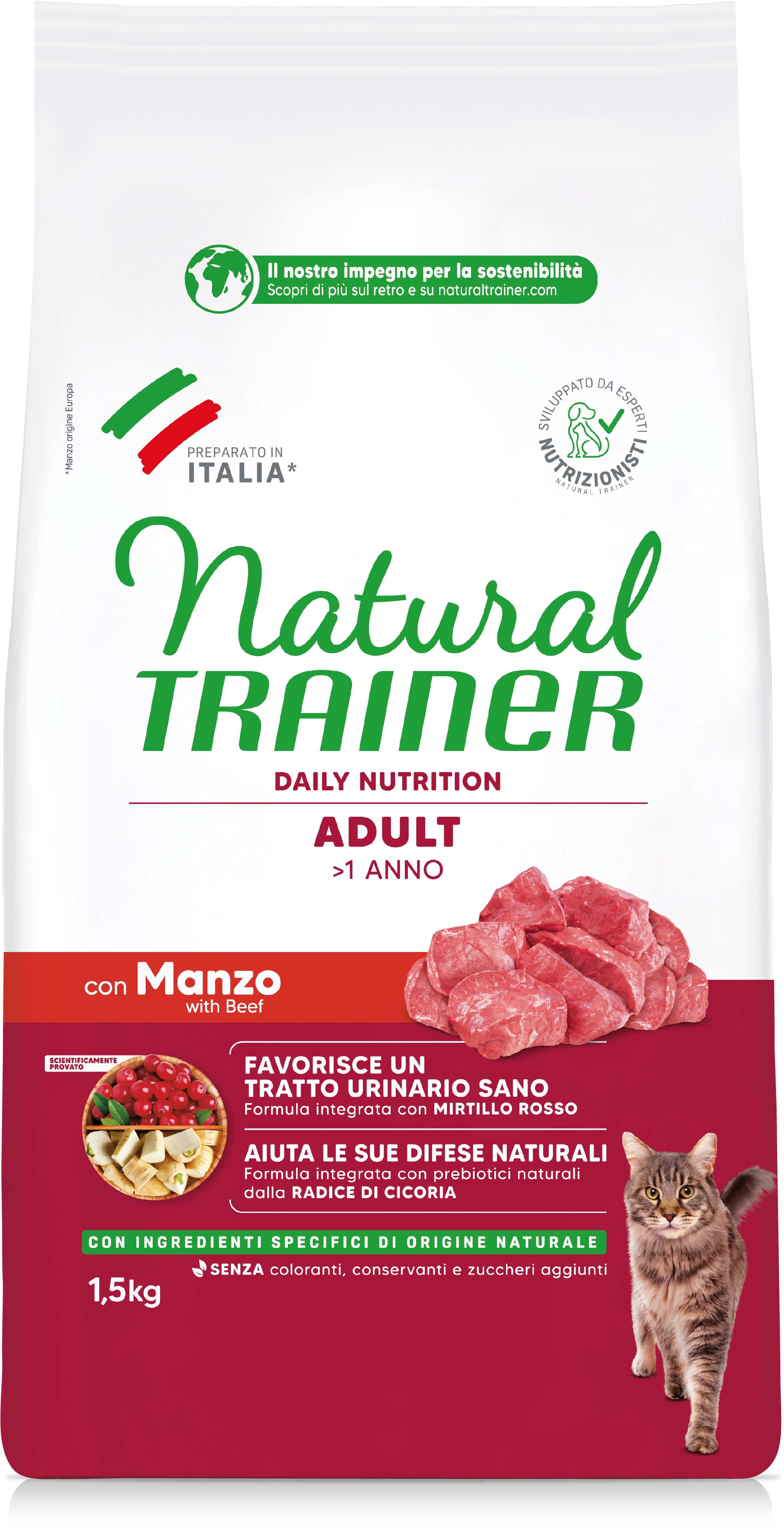 Natural Trainer Adult con Manzo è un alimento completo per gatti adulti a partire dal primo anno di vita, che fornisce al tuo micio acidi grassi essenziali, zinco e biotina, per contribuire alla salute della cute e alla lucentezza del mantello. La polpa di barbabietola e l'estratto di radice di cicoria forniscono all'animale importanti prebiotici di origine naturale, per favorire il corretto equilibrio del microbiota intestinale, mentre gli estratti di mirtillo rosso e di radice di cicoria e i livelli controllati di minerali aiutano a mantenere nel tempo il corretto funzionamento delle vie urinarie.