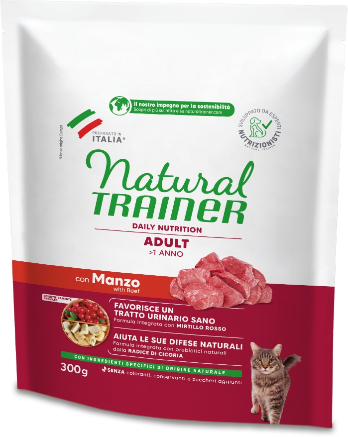 Crocchette Natural Trainer Adult con Manzo per gatti adulti, con componenti specifici naturali, estratto di mirtillo rosso, polpa di barbabietola, estratto di radice di cicoria, zinco e Omega 3 & 6