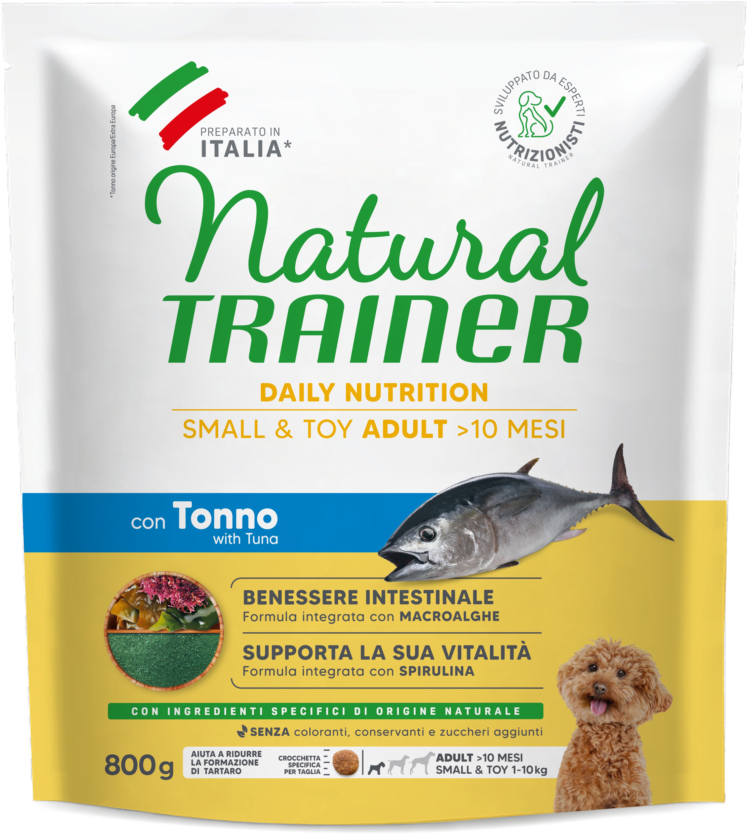 L' alimento completo per cani di piccola taglia della linea Trainer Natural contiene preziose sostanze naturali nutrienti. Il tonno e il riso sono integrati con l' alga spirulina un ingrediente funzionale ricco di principi nutritivi ad azione rivitalizzante e rigenerante. Le naturali proprietà dell’estratto di Yucca contribuiscono a ridurre l’odore delle feci, aiutando a limitare le fermentazioni proteiche intestinali. Trainer natural contiene una formula speciale di Vitamina C che aiuta a prevenire la formazione di tartaro e l' alito cattivo. Inoltre la carne fresca favorisce il regolare mantenimento della muscolatura del tuo cane, conferendo appetibilità ed elevata digeribilità al mangime per cani Trainer Natural.