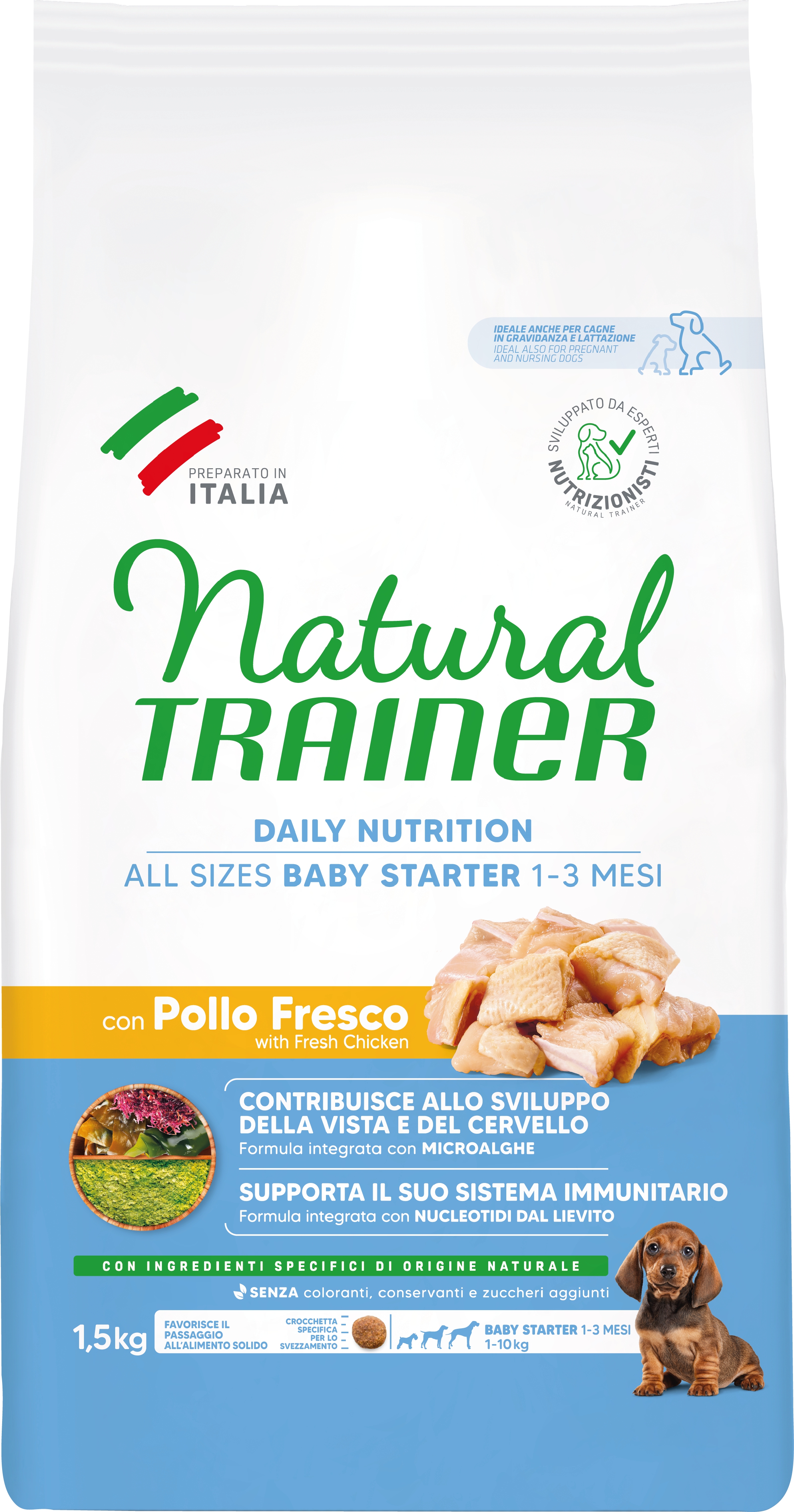 Il mangime è pronto per l’uso e va servito a temperatura ambiente. Lasciare sempre a disposizione dell’animale acqua fresca. Cagne in gestazione e lattazione: 20 giorni prima del parto, iniziare a sostituire gradualmente l’alimento usato in precedenza con Natural Trainer Baby Starter, in modo che a 10 giorni dal parto l’animale si nutra soltanto con il nuovo alimento.