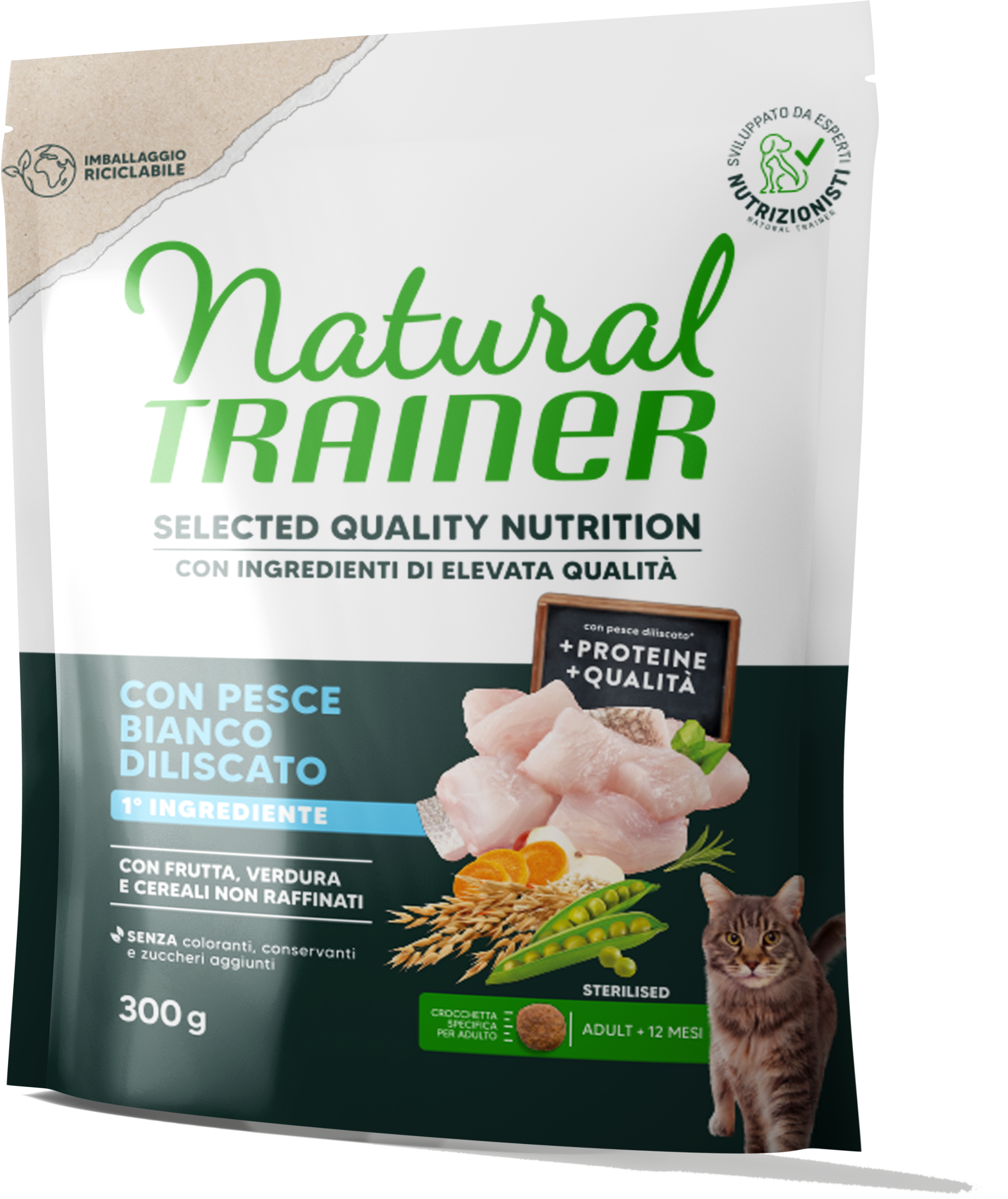 Natural Trainer Selected Quality Nutrition Gatto Healthy Grain Sterilised Pesce Bianco 300g