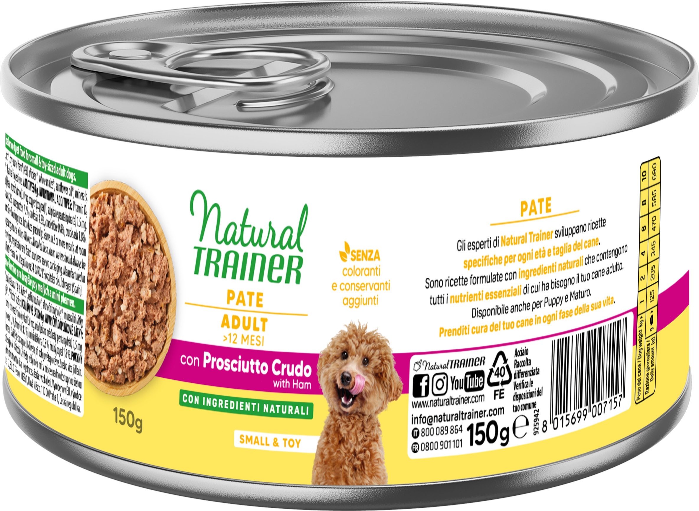 Alimento umido prodotto con una combinazione di prosciutto come fonte di proteine, e yucca come ingrediente funzionale. Un alimento completo che apporterà al vostro cane di taglia piccola (<10kg.) l’energia di cui ha bisogno.