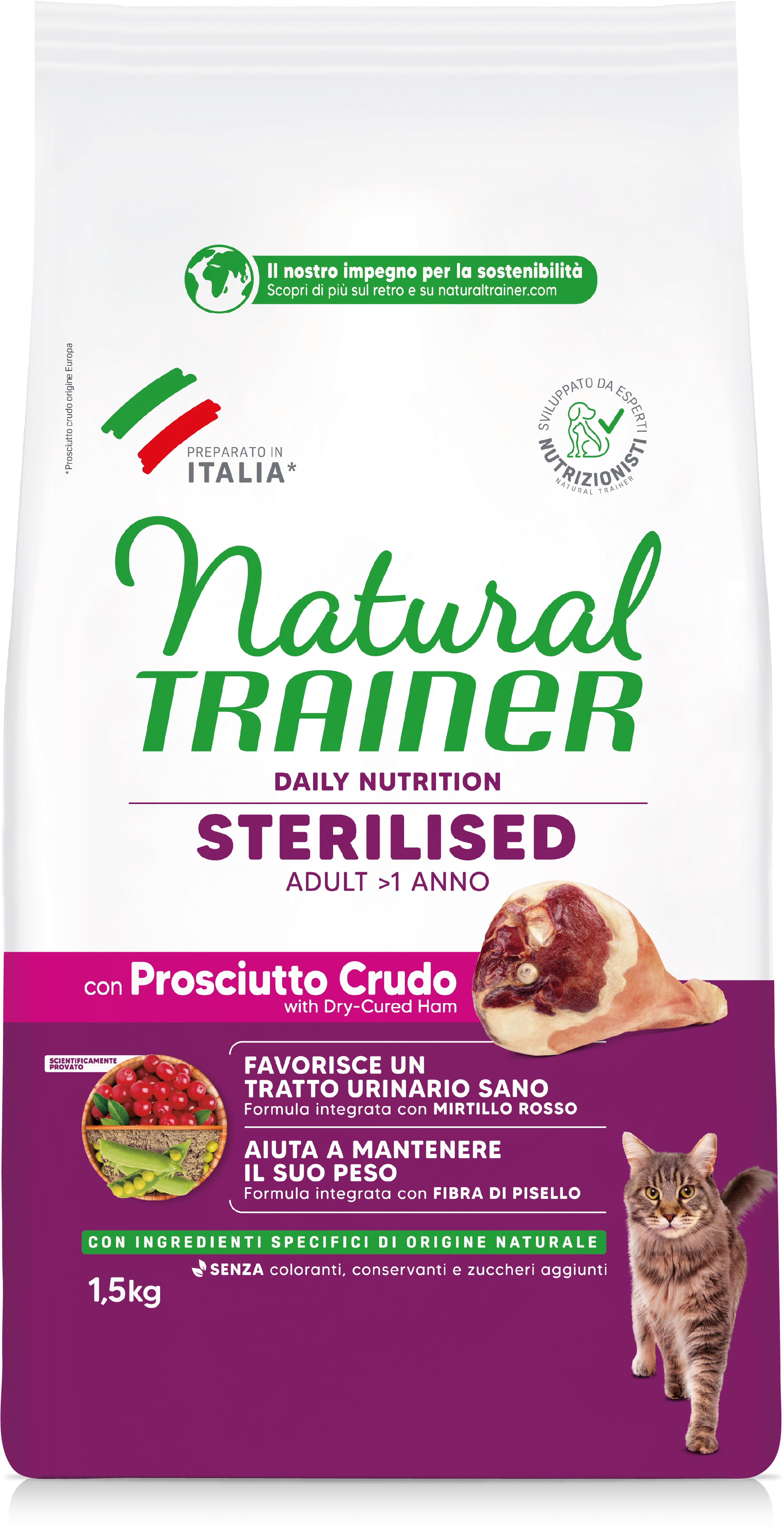 • Natural Trainer Sterilised Prosciutto Crudo 1,5 kg Gatto in Gatti