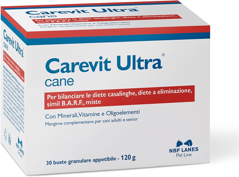 Carevit Ultra cane è un mangime complementare per cani in granulare appetibile formulato rispettando le linee guida FEDIAF e i riferimenti NRC, con sostanze minerali,vitamine ed oligoelementi essenziali per bilanciare la dieta casalinga del cane e garantire uno stato di salute ottimale; integra la razione giornaliera dei cani adulti e anziani, le diete di eliminazione, le diete a base di carne e/o frattaglie senza cereali (simil Barf senza ossa), le diete miste (commerciale + casalinga: quando la dieta casalinga apporta più del 50% del fabbisogno energetico). Privo di proteine animali (l’unica fonte di proteine è il lievito di birra, ben tollerato e apprezzato dai cani); non contiene aromi, coloranti o conservanti.