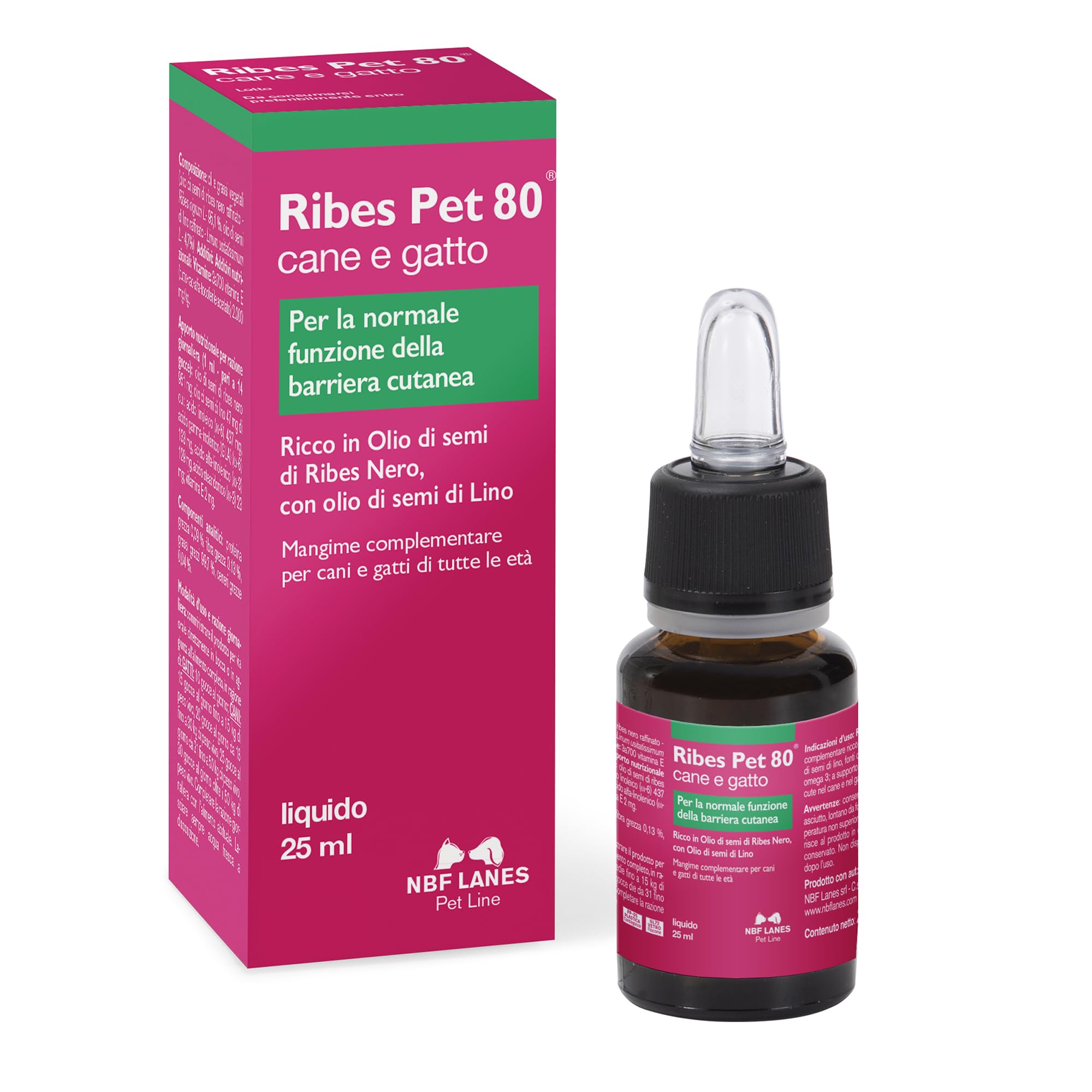 Supporto della funzione dermica in caso di dermatosi ed eccessiva perdita di peli Ribes Pet 80 in gocce, ad elevata concentrazione di acidi grassi essenziali, può essere utile come adiuvante nei casi di aumentato fabbisogno di Ac. g-Linolenico o di Ac. Stearidonico, frequente in diverse situazioni quali: stress, stati allergici o atopici, arrossamenti cutanei con sintomatologia pruriginosa, alterazione della barriera cutanea, eccessiva perdita di pelo, alimentazione con cibi a lunga conservazione.