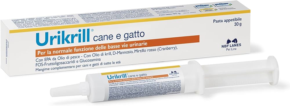 Urikrill pasta appetibile con EPA da olio di pesce, D-mannosio, mirtillo rosso, FOS-fruttoligosaccaridi e glucosamina, è indicato per la normale funzione delle vie urinarie nel gatto e nel cane di piccola taglia, favorendo il fisiologico benessere dell’urobioma.