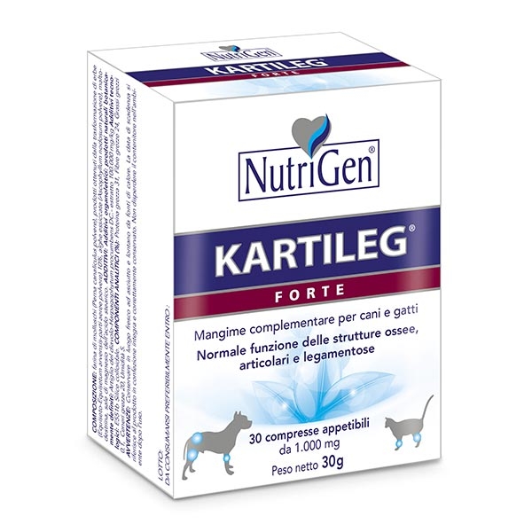 KARTILEG FORTE è un mangime complementare per cani e gatti formulato in compresse appetibili, utile per favorire il normale benessere e la normale funzione delle strutture ossee, articolari e legamentose.