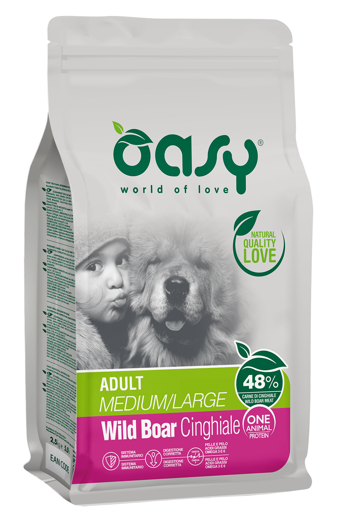 Oasy cane adult all breed cinghiale 12 kg è un alimento completo per cani adulti di tutte le taglie di un anno o piu.