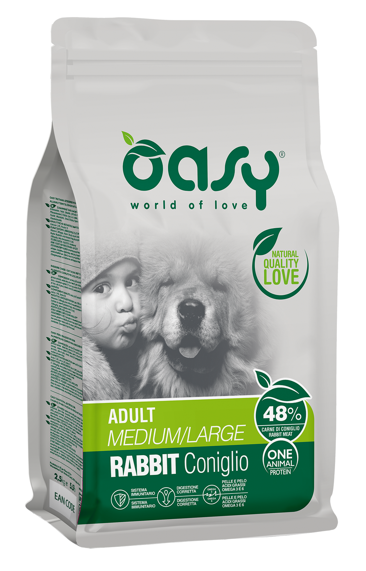 Oasy cane adult coniglio 12 kg è un alimento completo per cani adulti di tutte le taglie