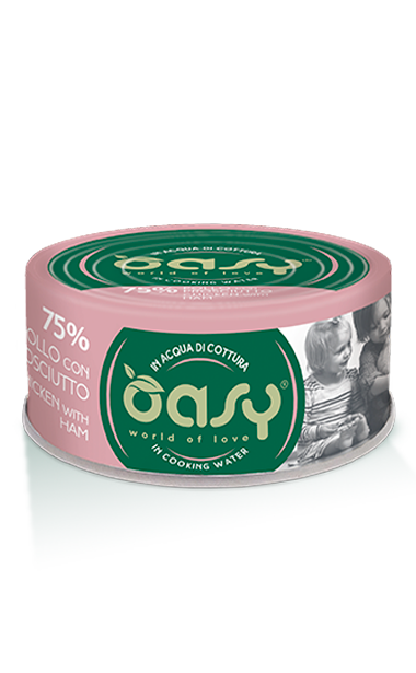 Oasy More Love Pollo Con Prosciutto Lattina 70 gr Per Gatticonfezione da 12 pz. € 0.99 cad. prezzo unitario