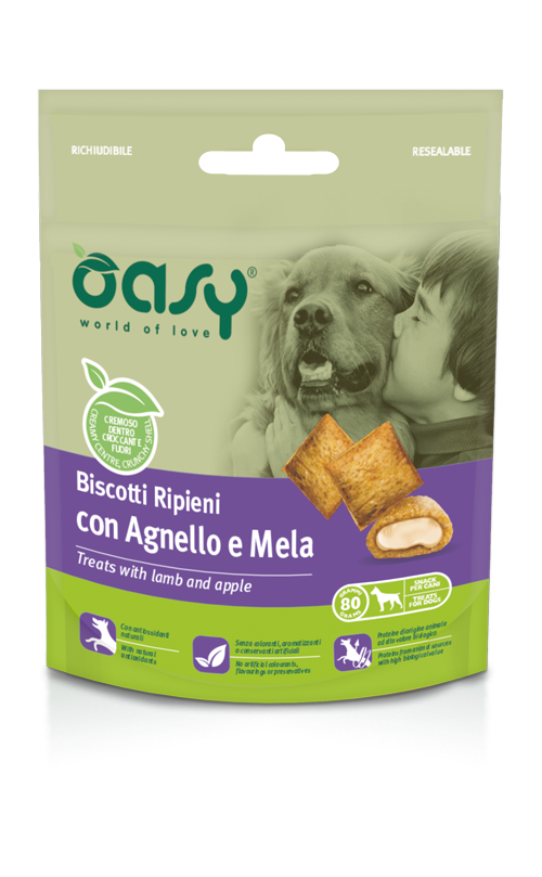 Recensioni per Oasy Snack Biscotti Ripieni Con Agnello e Mela per Cani 80 g