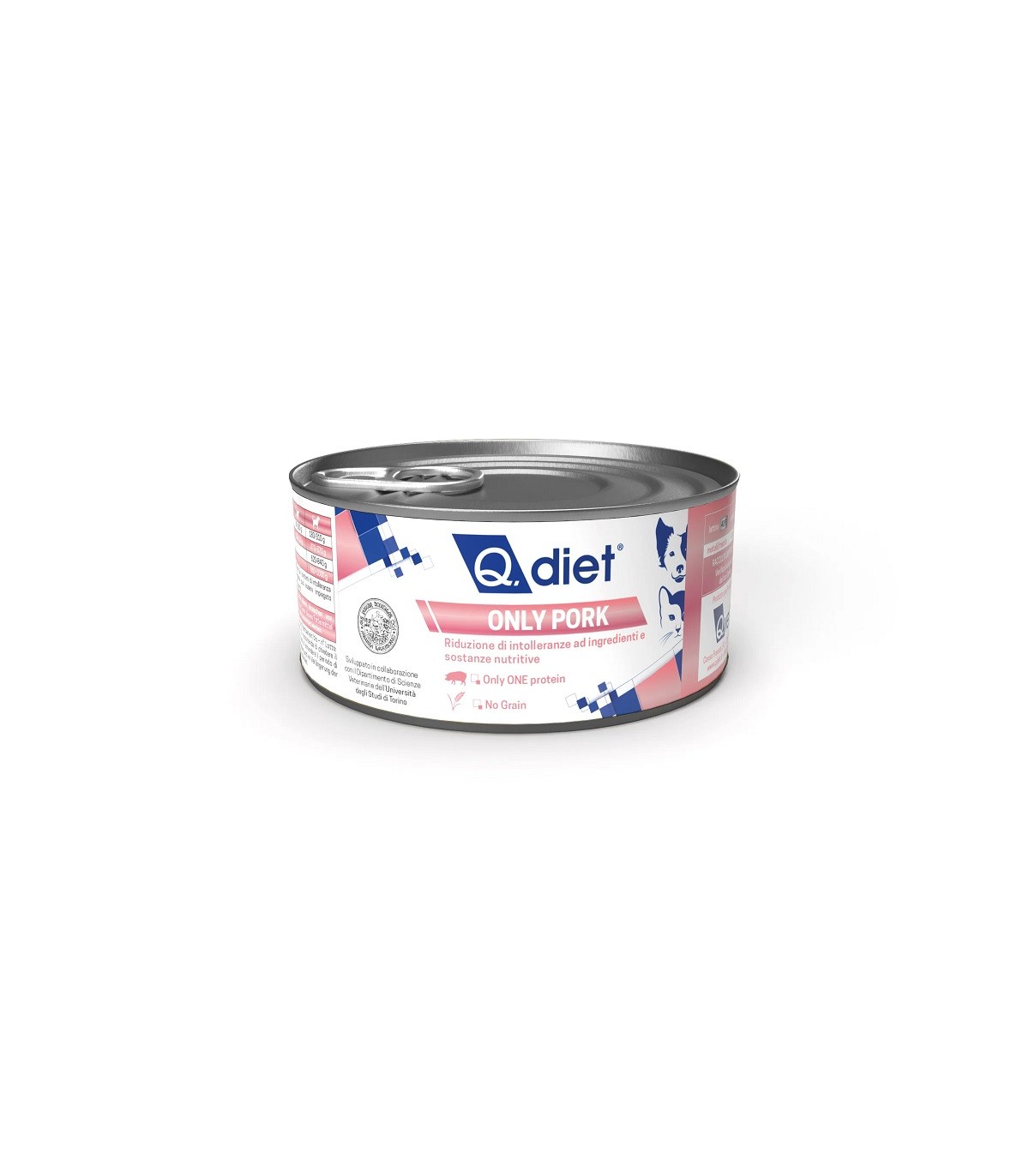 Q.diet only fresh pork 150 gr: è alimento dietetico composto da un'unica fonte proteica e senza cereali, a cui sono stati aggiunti oli vegetali ricchi in Omega-3, minerali e taurina. Senza conservanti e senza antiossidanti.