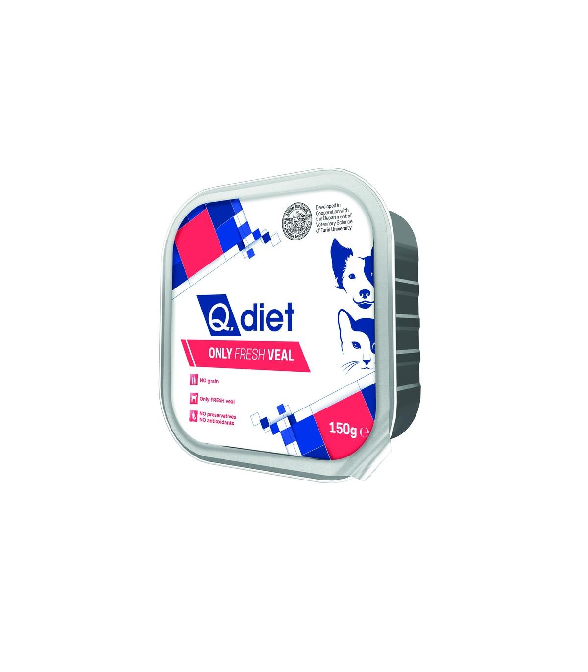 Q.diet only fresh veal 150 gr: è alimento dietetico composto da un'unica fonte proteica e senza cereali, a cui sono stati aggiunti oli vegetali ricchi in Omega-3, minerali e taurina. Senza conservanti e senza antiossidanti.