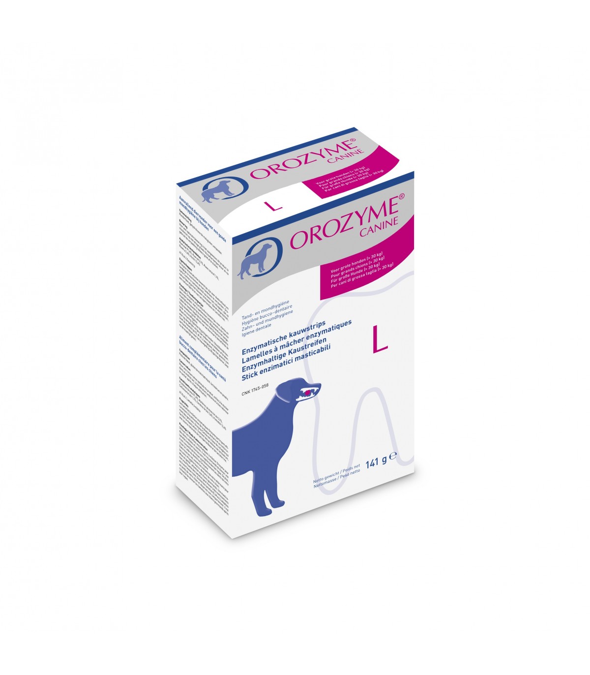 Lo stick enzimatico masticabile Orozyme contribuisce efficacemente a prevenire la placca dentale e a rafforzare le gengive. Orozyme Canine a base di collagene agevola la masticazione. Contiene proteine del siero del latte., fonte naturale di lattoperossidasi e lattoferrina.