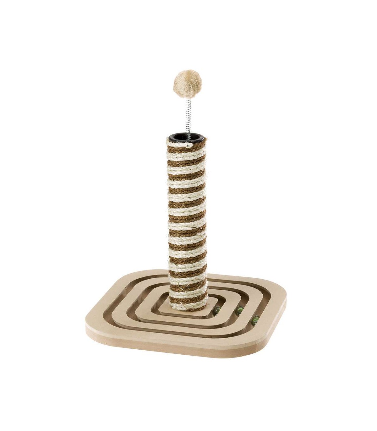 Ha una solida base in legno e colonna centrale in sisal, la fibra naturale preferita da tutti i gatti! Questo tiragraffiè dotato di una divertente palla-gioco a molla; la base presenta un circuito intagliato in legno sul quale far correre tre piccole biglie. Di dimensioni compatte, questo accessorio per gatti contiene gli strumenti necessari per il vostro amico per rifarsi le unghie, stiracchiarsi e esercitare i proprio riflessi, mantenendosi così sempre attivo.