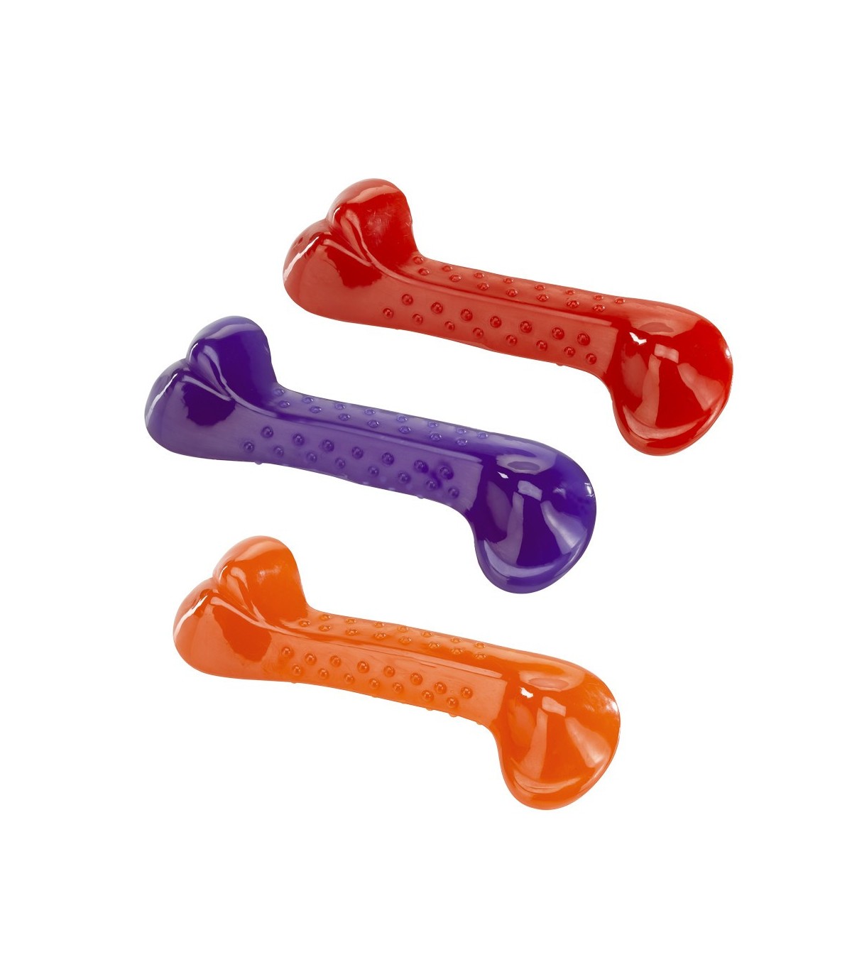 Un gioco per cani in poliuretano a forma di osso e realizzato con materiali di prima scelta, in modo da risultare perfettamente sicuro per gli animali. Disponibile in tre diverse dimensioni, PA 6482, PA 6484 e PA 6486, pensate per cani di tutte le taglie,è utile per soddisfare la loro naturale esigenza di mordere. Il materiale con cuiè prodotto, il poliuretano, lo rende inoltre particolarmente resistente; il tutto senza dimenticare l'estetica grazie al particolare effetto traslucido dato dalla trasparenza colorata. Un passatempo piacevole ma anche utile per il vostro amico peloso, visto che i dentini in rilievo di cuiè dotato provvedono alla pulizia dei denti.
