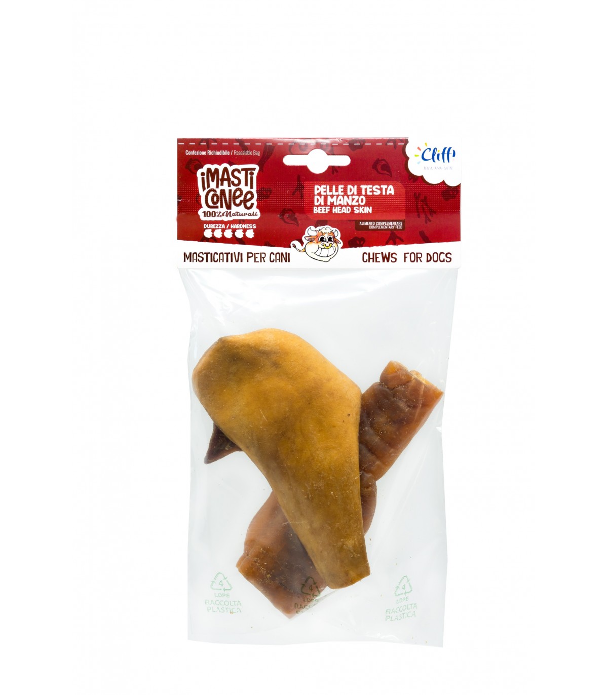 COMPOSIZIONE: Pelle di testa di manzo intero essiccata. 100% Manzo. Non contiene additivi.