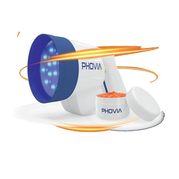 Il sistema Phovia consiste nella lampada multi-LED, portatile, alimentata a batteria, per illuminare e il kit, composto da gel vettore e cromofori attivi che emettono lenergia luminosa fluorescente (FLE) quando esposti alla luce della lampada.