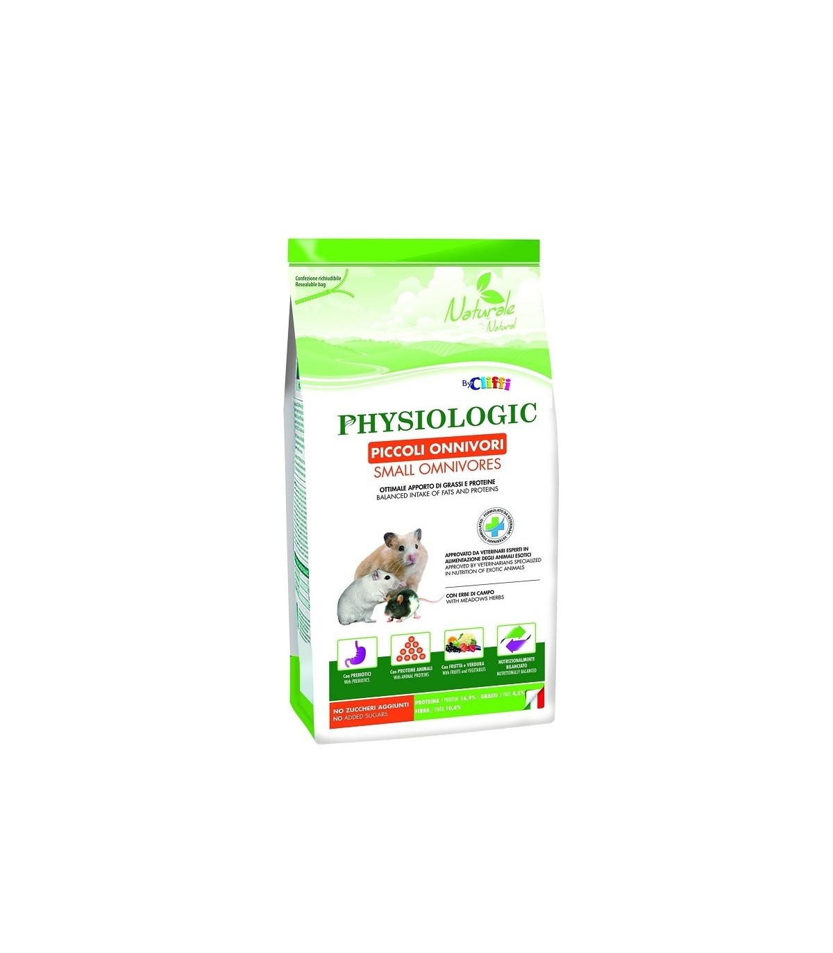 Caratteristiche: PHYSIOLOGIC PICCOLI ONNIVORI (Criceti, Ratti, Gerbilli)è l'alimento studiato da veterinari esperti nell'alimentazione degli animali esotici, tenendo conto delle esigenze naturali dei criceti e degli altri piccoli onnivori. Nutrizionalmente bilanciato, contiene erbe di campo (naturalmente costituite da oltre 40 tipologie di erbe, fra cui le graminacee come il Fleolo, il Loietto, la Poa, il Bromus, la Festuca, l'erba Marzolina, e tante altre essenze il cui numero e la cui tipologia può variare in base al momento della raccolta). Contiene, inoltre, 10 diverse erbe aromatiche selezionate per il benessere dei piccoli roditori. Il corretto contenuto di fibre di lunghezze diverse, fino a 3 mm e la presenza di prebiotici (F.O.S 0,9%) favoriscono una buona digestione. Contiene cereali fioccati, per garantirne l'alta digeribilità, e proteine della carne nel quantitativo ideale per soddisfare i fabbisogni degli animali onnivori. Non contiene frutta in guscio, aromi artificiali e zuccheri aggiunti. Contiene lievito di birra (noto come fonte naturale di vitamine del gruppo B), Mela e Carota (ideali per completare la dieta degli onnivori). Il ridotto tenore di grassiè utile per il controllo del peso.